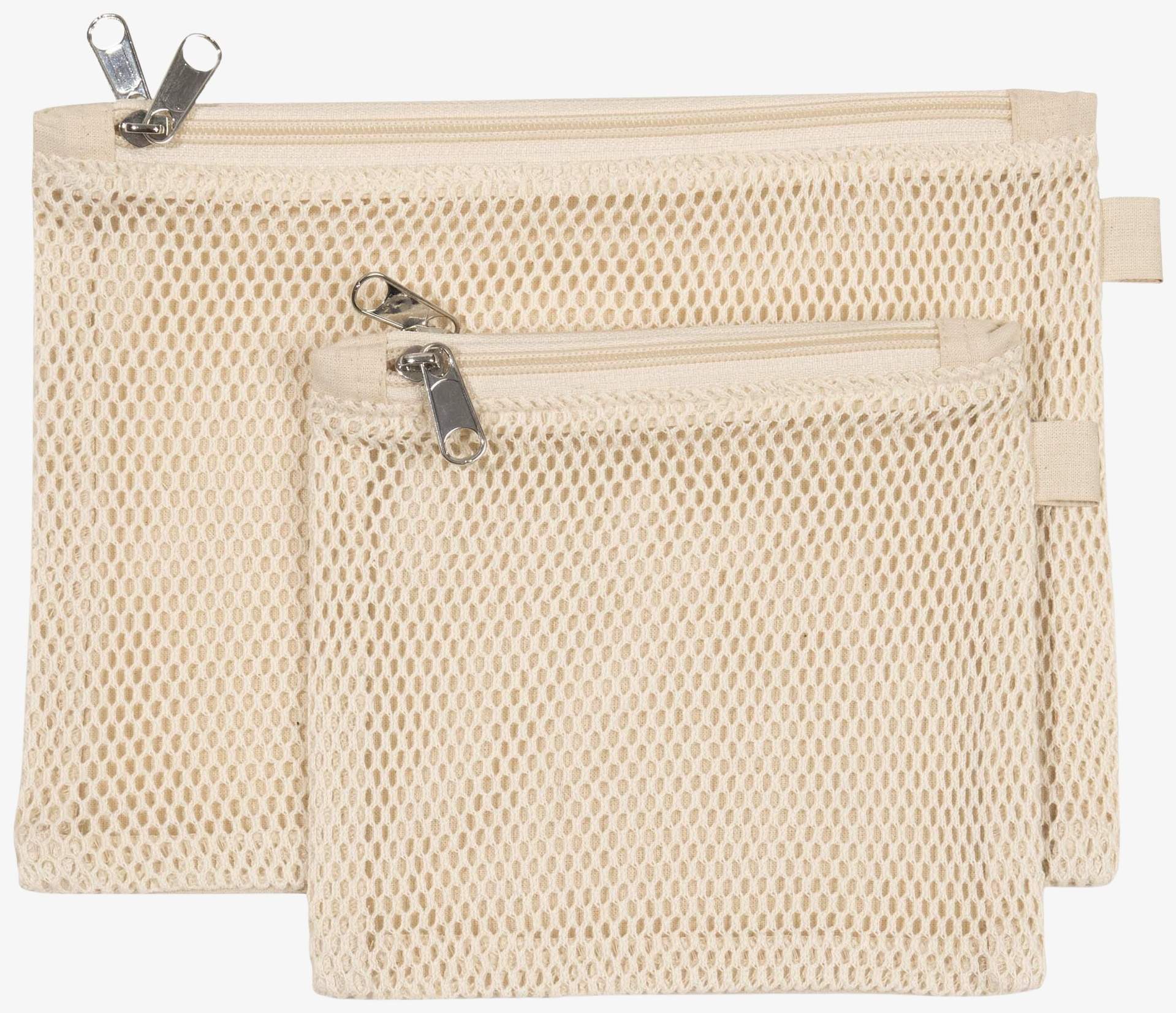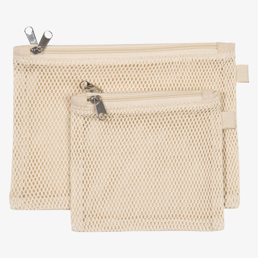 De twee-vaks etui heeft een vak in canvas katoen en een tweede in katoen gaas, beide afgesloten met een ritssluiting. Verkrijgbaar in twee formaten.