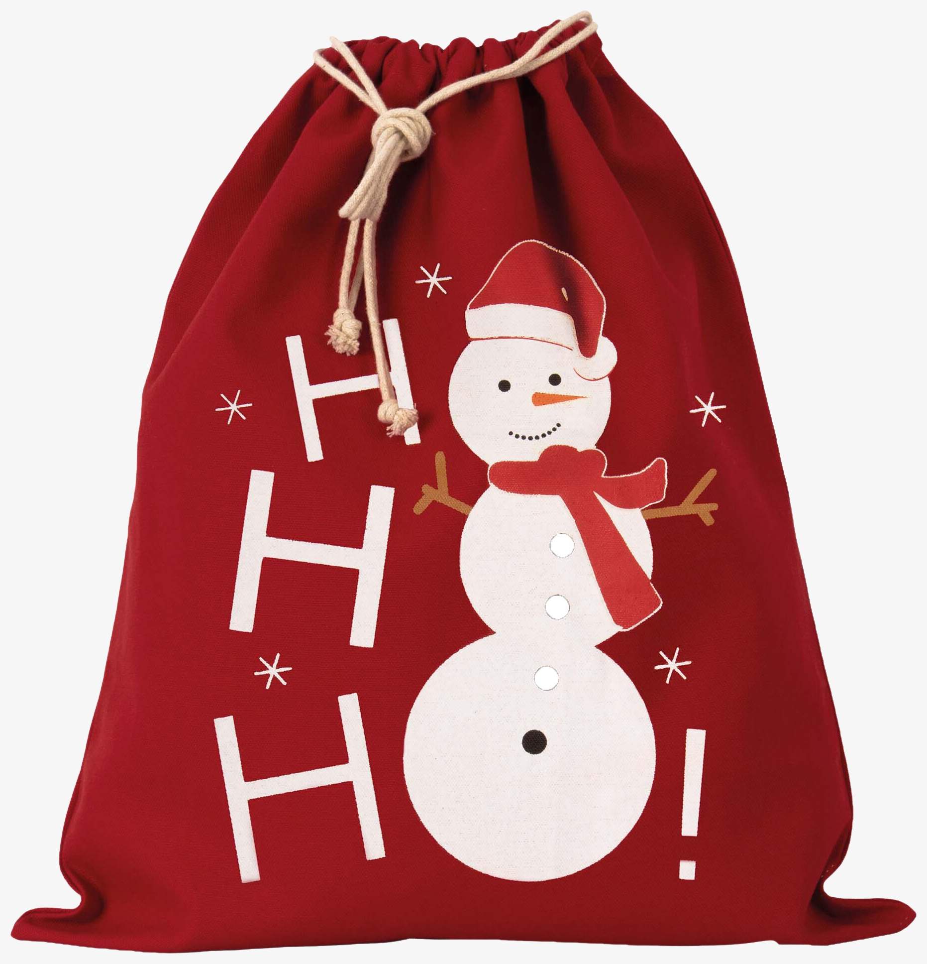 De katoenen zak met trekkoord sneeuwpopmotief is gemaakt van 100% katoen. Hij heeft een sluiting met trekkoord en een sneeuwpopprint.