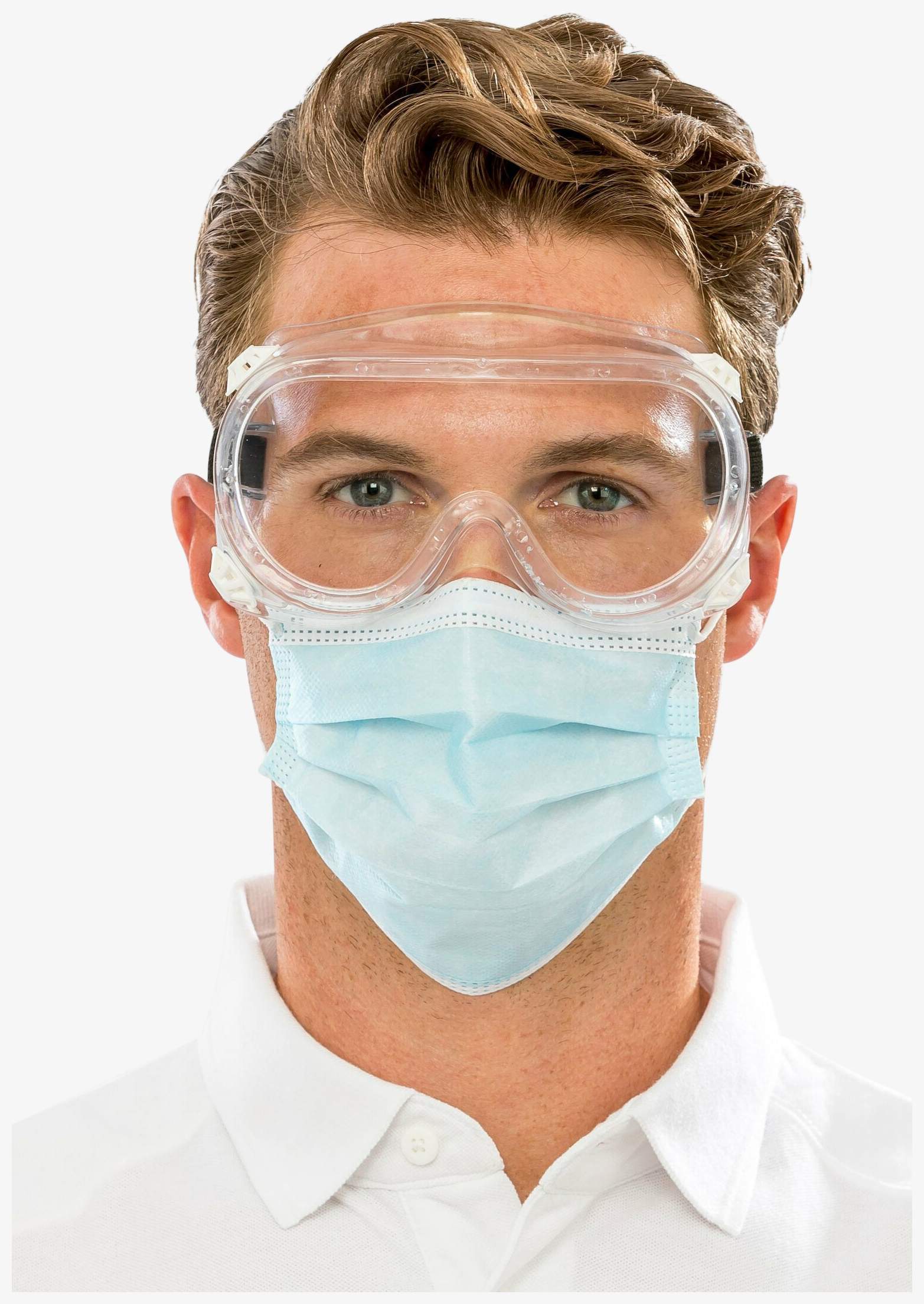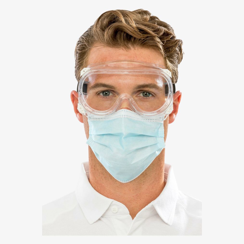 De wegwerpbeschermbril is ontworpen om spetters van druppels en damp te beperken. Kan gedragen worden over de meeste correctiebrillen. De zijkanten zijn bedekt om luchtcirculatie mogelijk te maken en beslaan te voorkomen. Het montuur is flexibel en ondersteunt de neus. Een elastische band houdt de bril op zijn plaats. Dit apparaat garandeert geen preventie tegen overdracht van ziekten of virussen.