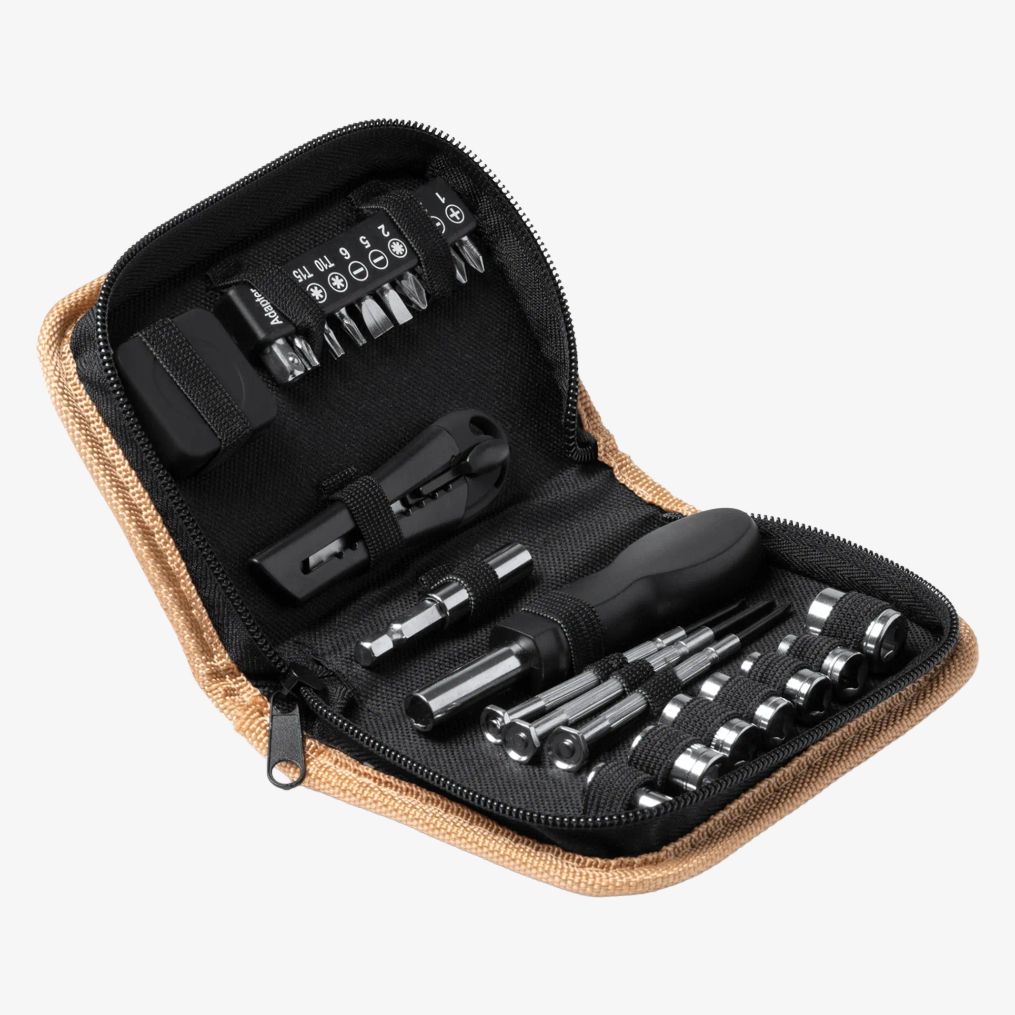 Zestaw narzędzi 25 akcesoriów zawiera nóż, klucz imbusowy, śrubokręt krzyżakowo-płaski oraz narzędzie do mocowania miarki 100 cm. Całość znajduje się w etui z korka w ekologicznej pudełku.
