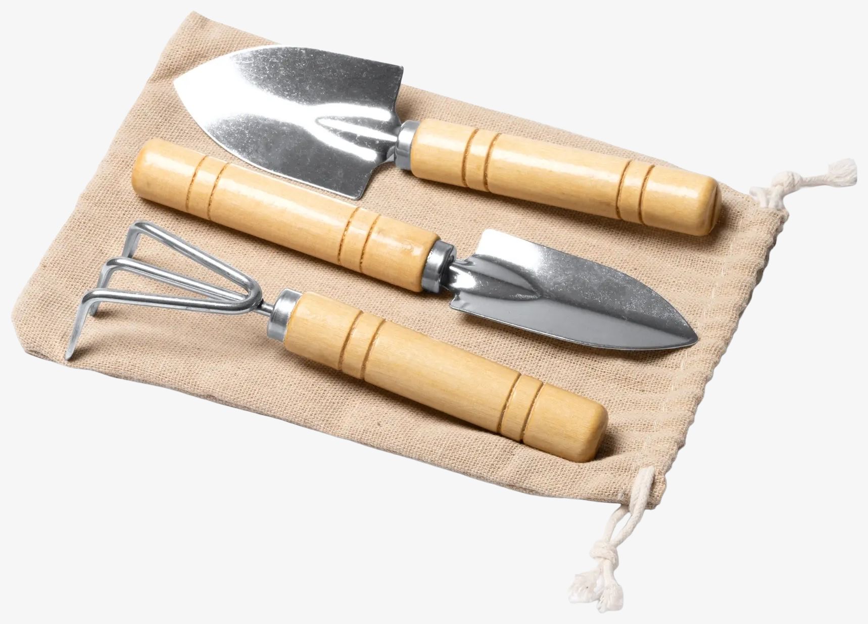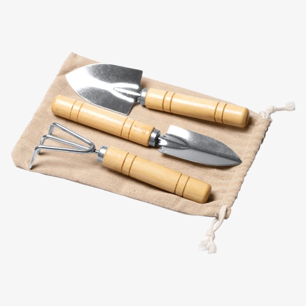 Zestaw narzędzi ogrodniczych ze stali nierdzewnej zawiera trzy akcesoria ze stali nierdzewnej z bambusowymi uchwytami oraz bawełnianą pokrowiec. Narzędzia przeznaczone do różnych prac ogrodniczych, zapakowane w ekologiczne pudełko.