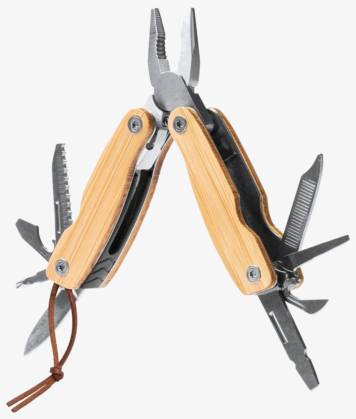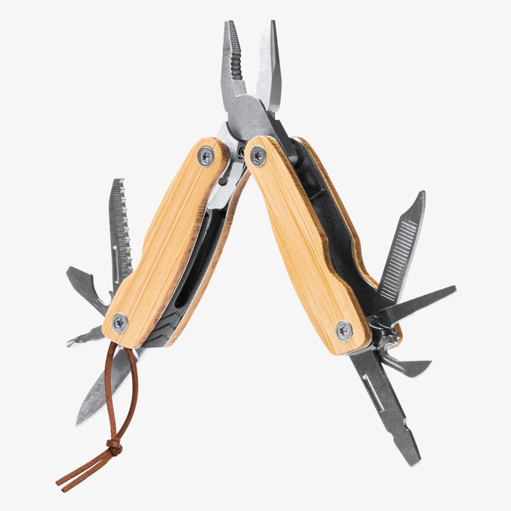 MURDOK to wielofunkcyjne narzędzie składające się z korpusu i akcesoriów wykonanych ze stali nierdzewnej z bambusową rączką. Zawiera 12 różnych funkcji, takich jak żyletka, piła, pilniki, otwieracz do drzwi, śrubokręty i szczypce.