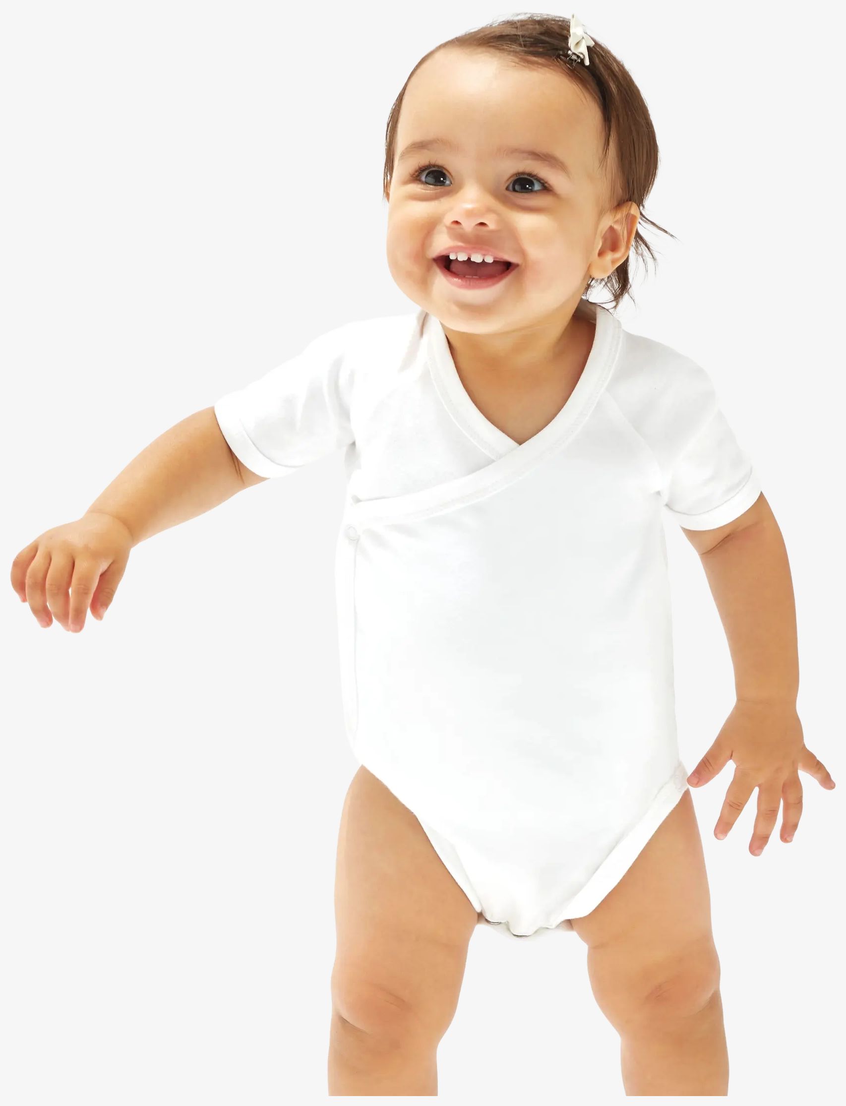 Organic Baby Kimono Bodysuit to body niemowlęce z czesanej bawełny organicznej, z dzianiny interlock. Otwór typu kimono oraz napy z przodu u dołu ubranka ułatwiają ubieranie.