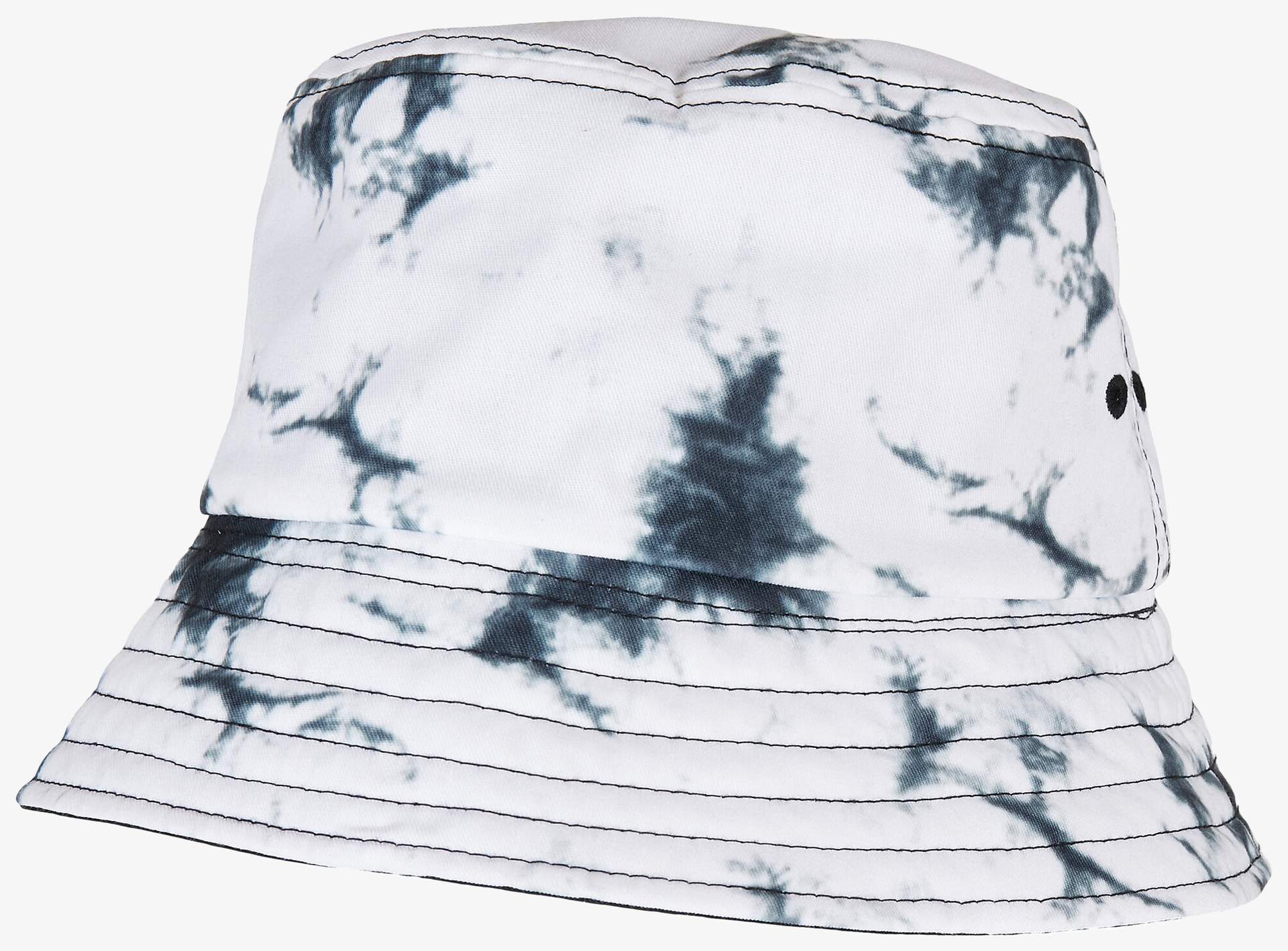 Dwustronny kapelusz z poliestru łączy dwukolorowy, wyblakły wzór z jednej strony i jednolity czarny kolor z drugiej. Ma płaski daszek z ozdobnymi szwami oraz obszyte nacięcia wentylacyjne. Rozmiar uniwersalny, bez zapięcia.