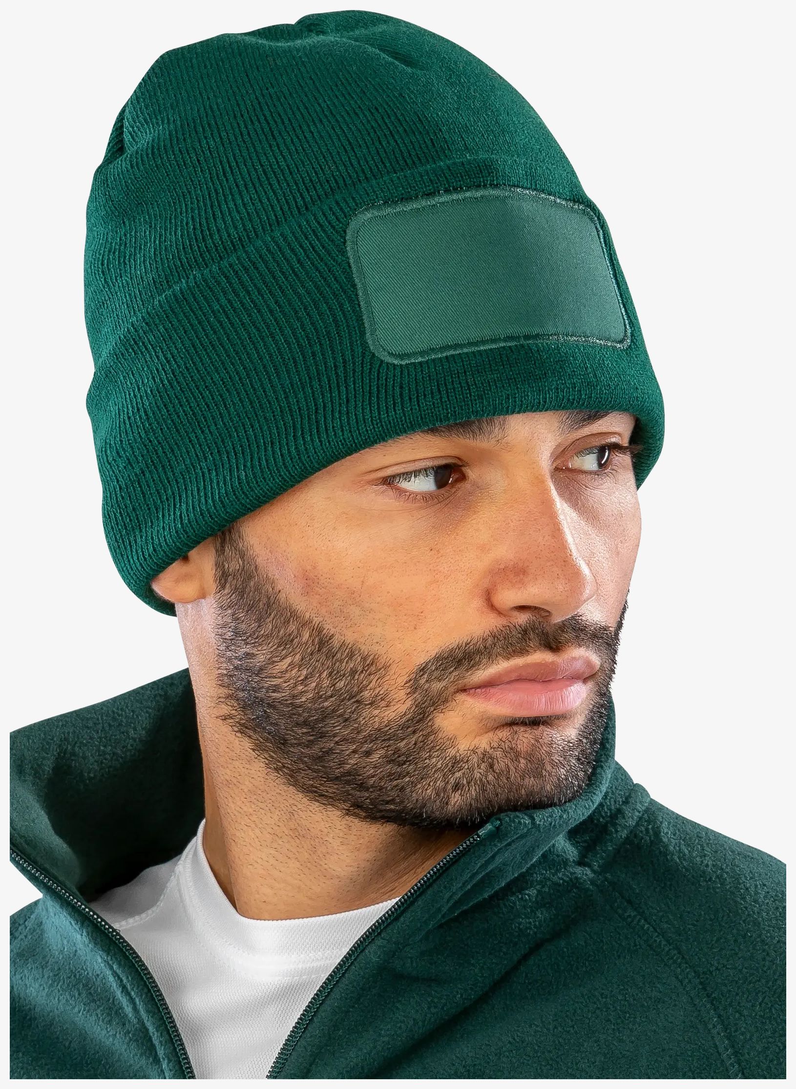 Double knit Beanie to kryjąca, dwuwarstwowa czapka z grubej dzianiny o miękkim dotyku, z dużym wywiniętym mankietem i naszywką z bawełny o splocie skośnym.