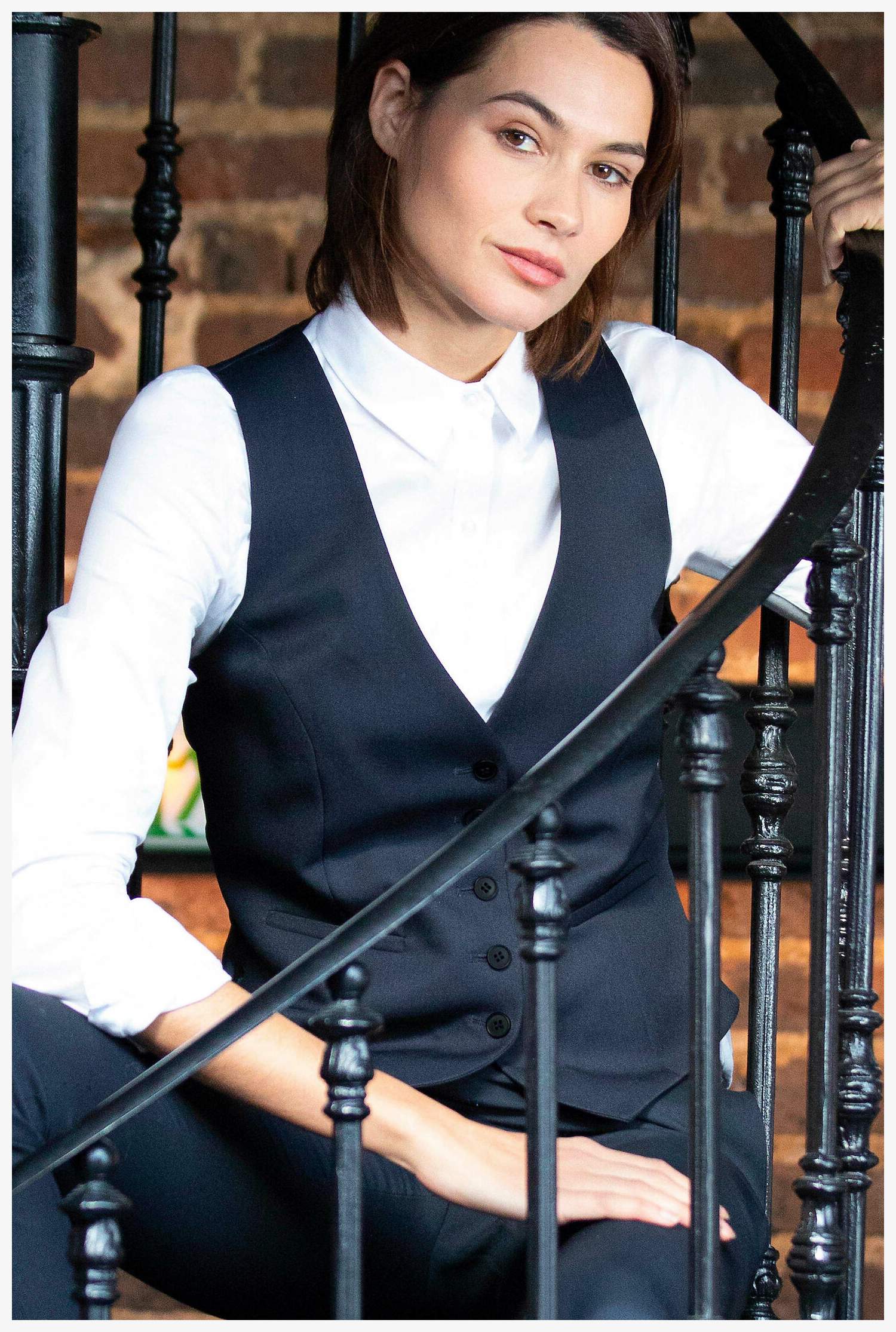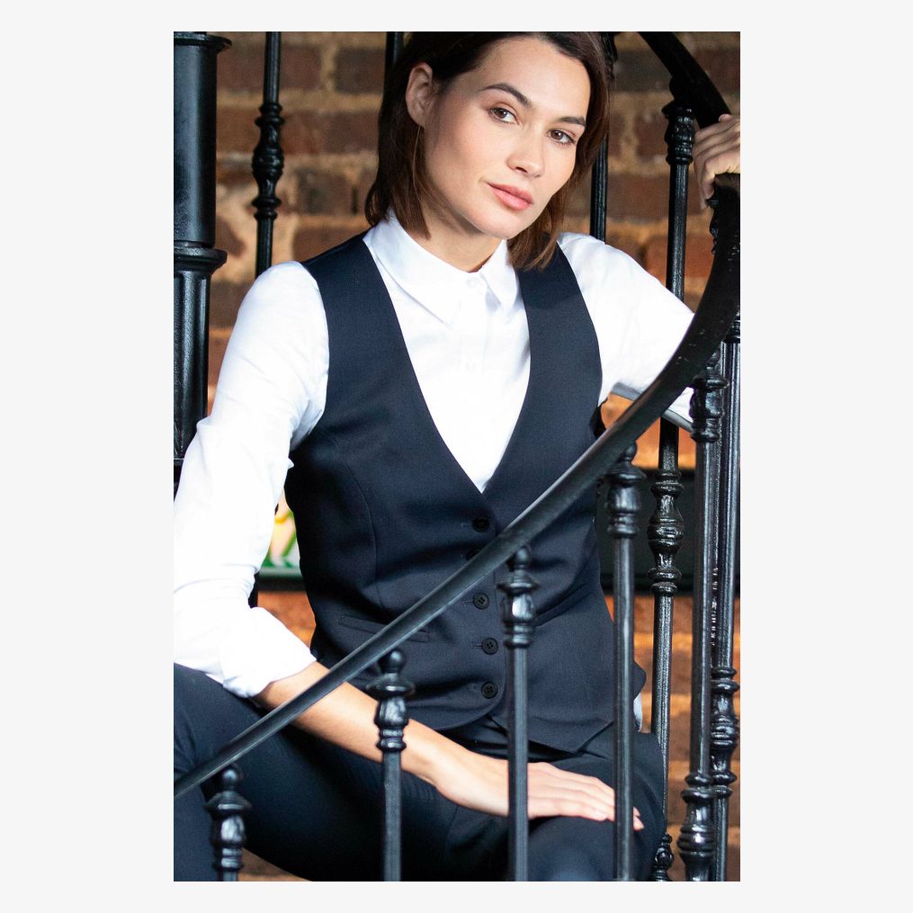 Kamizelka marynarkowa damska Max Women jest wykonana z tkaniny twill 204. Posiada 5 guzików i 2 przednie kieszenie z lamówką. Pasek regulacyjny z tyłu zawiera metalową klamrę.