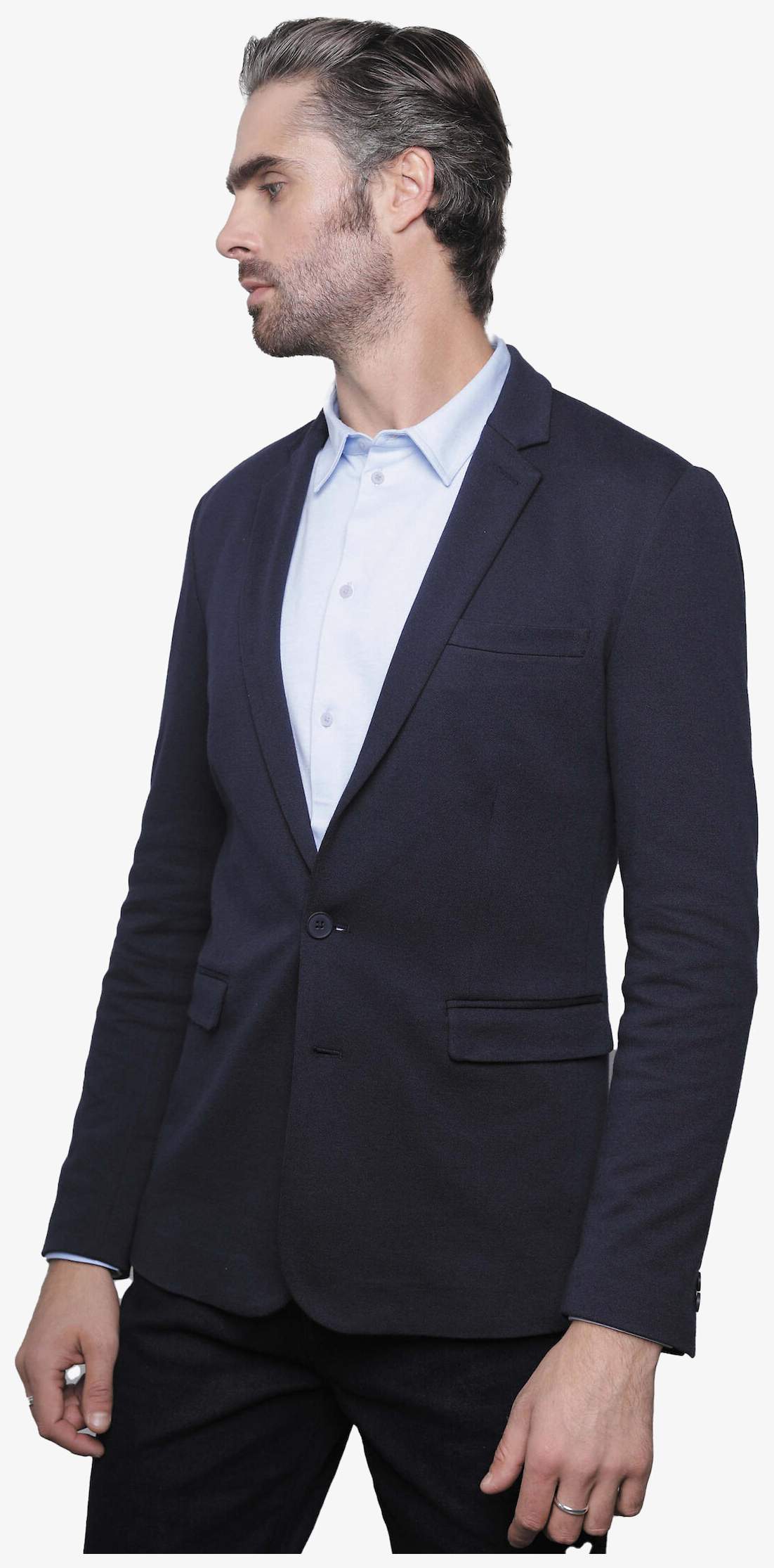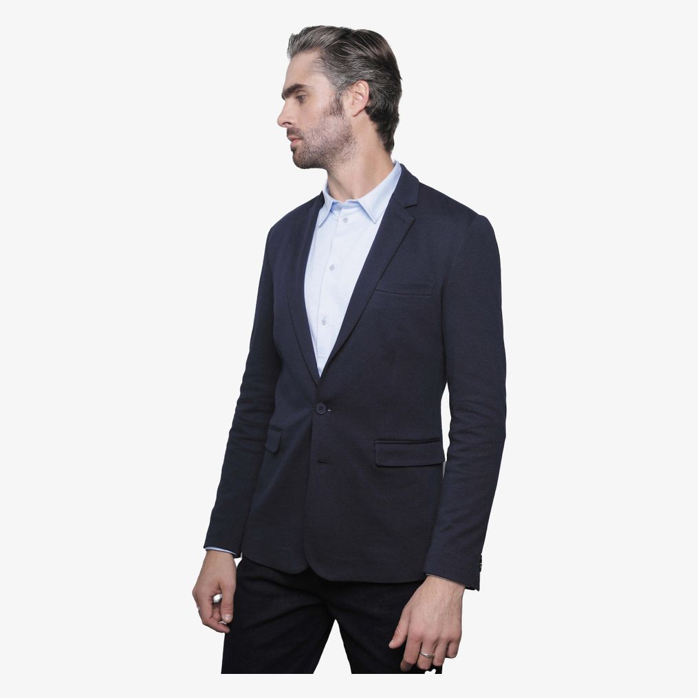 Marynarka z dzianiny pikowanej dla mężczyzn zawiera kołnierz typu tailleur, zapięcie na dwa guziki, dwie kieszenie z patką oraz kieszeń piersiową z wypustką. Półpodszewka ma rozcięcie z tyłu.