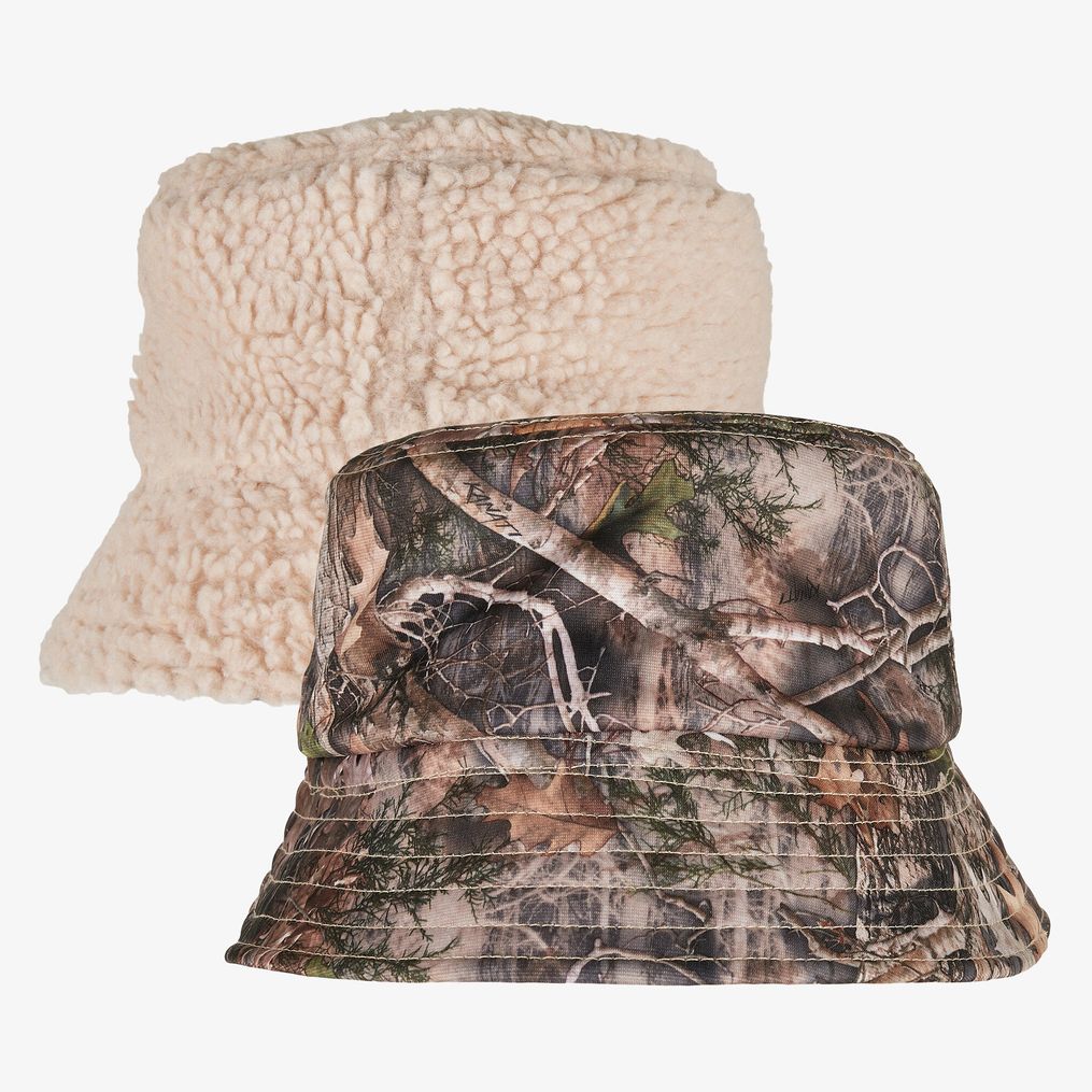 Sherpa Real Tree Camo Reversible Bucket Hat ma dwie odrębne strony: jedna z roślinnym wzorem kamuflażu, druga z puszystym sherpa. Posiada klasyczne pochylone rondo z dekoracyjnymi szwami.