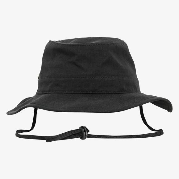 Kapelusz w stylu rybackim ma szerokie, płaskie lamówki zapewniające lepszy cień. Metalowe oczka wentylacyjne ułatwiają przepływ powietrza i ograniczają pocenie się. Troczek z blokadą zapewnia dobre utrzymanie na wietrze.