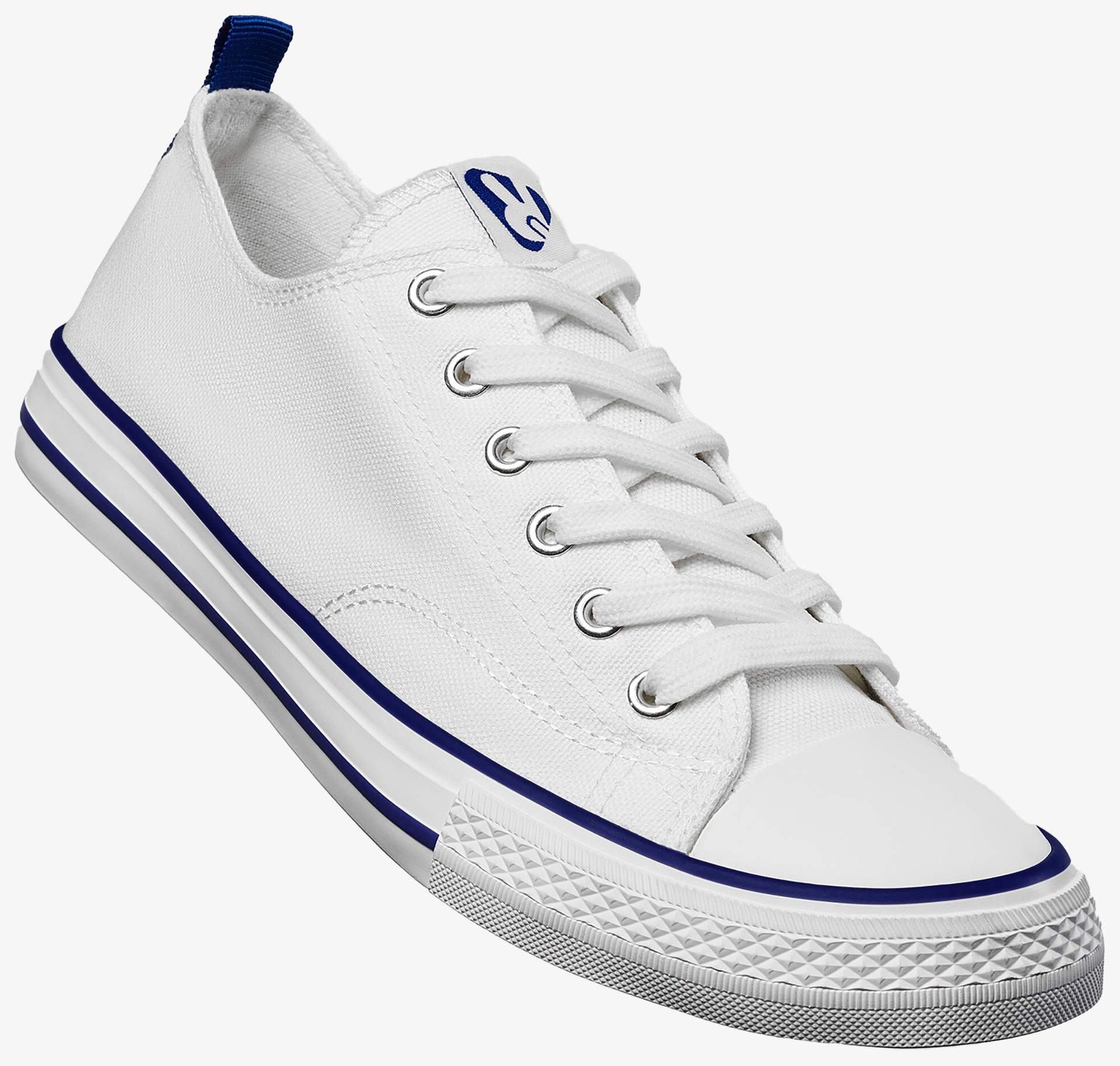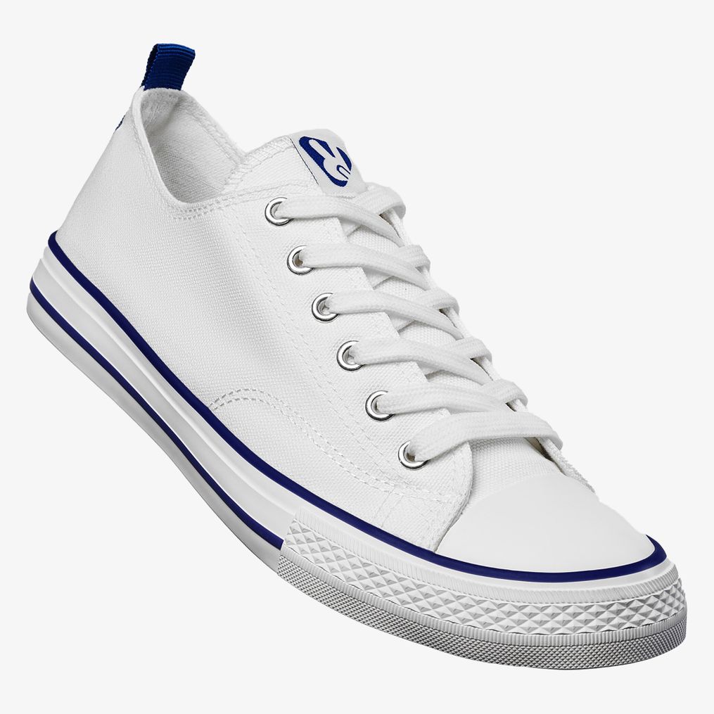 Buty Biles z bawełnianego płótna mają białą gumową podeszwę ozdobioną kolorowymi liniami. Wyposażone w boczne oczka wentylacyjne, gumowy nosek oraz zapięcie na sznurowadła.