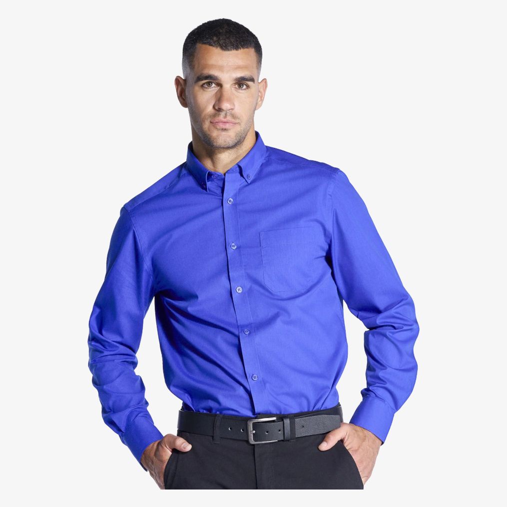Koszula z popeliny męska z długim rękawem posiada kołnierzyk na guziki i kieszeń na wysokości serca. Skład to 65% poliester 35% bawełna.