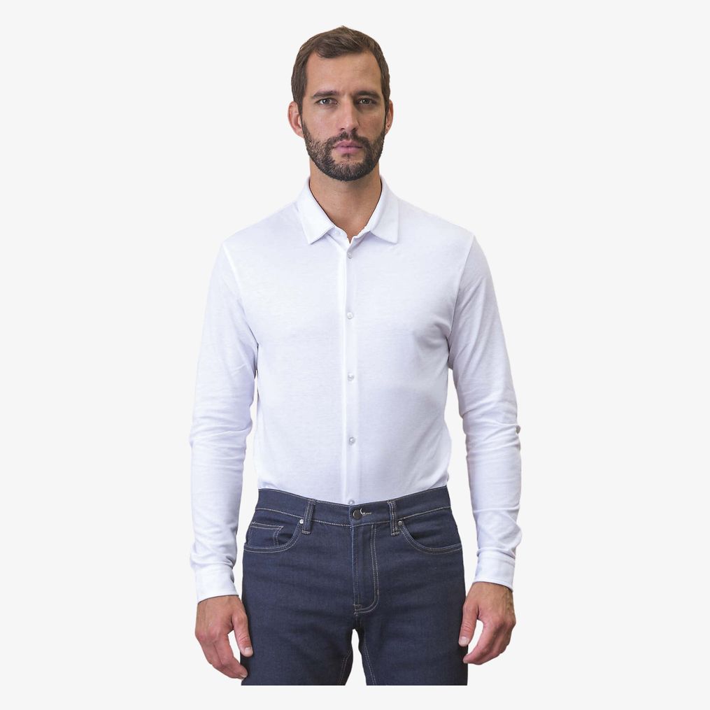Koszula męska z baweńny piko ma długie rękawy, klasyczny kołnierzyk oraz zaokrąglone manżety z 2 regulowanymi guzikami. Listwa na guziki zawiera 7 guzików w kolorze.