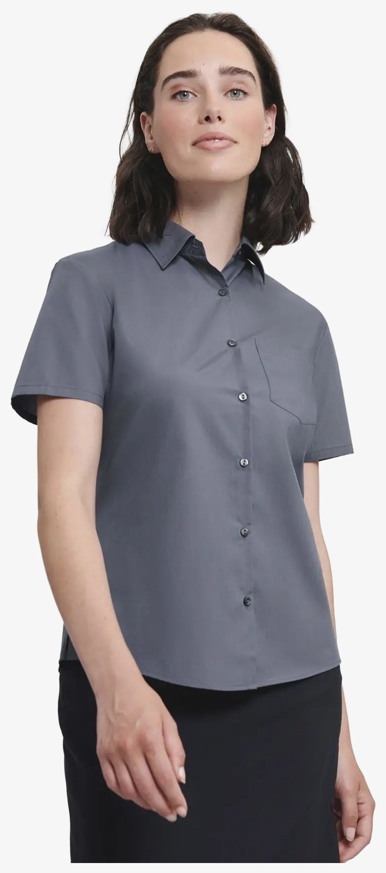 Koszula popelinowa z poliestru i bawełny z krótkim rękawem dla kobiet ma klasyczny krój z kieszenią na piersi, kołnierz z pojedynczym guzikiem i guzikami w tonacji. Dolna krawędź jest lekko zaokrąglona.