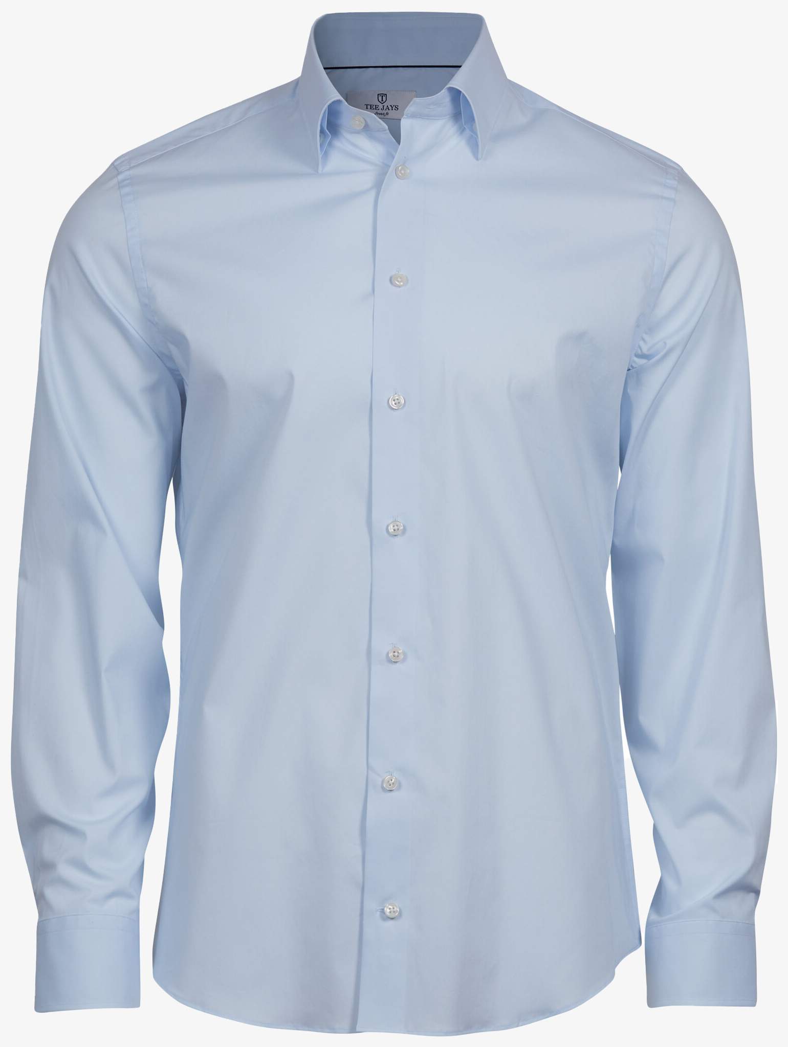 Dopasowana męska koszula stretch zawiera guziki na kołnierzu, karczek i zaszewki na plecach oraz zaokrąglony dół. Skład to 96% bawełna i 4% Lycra®.