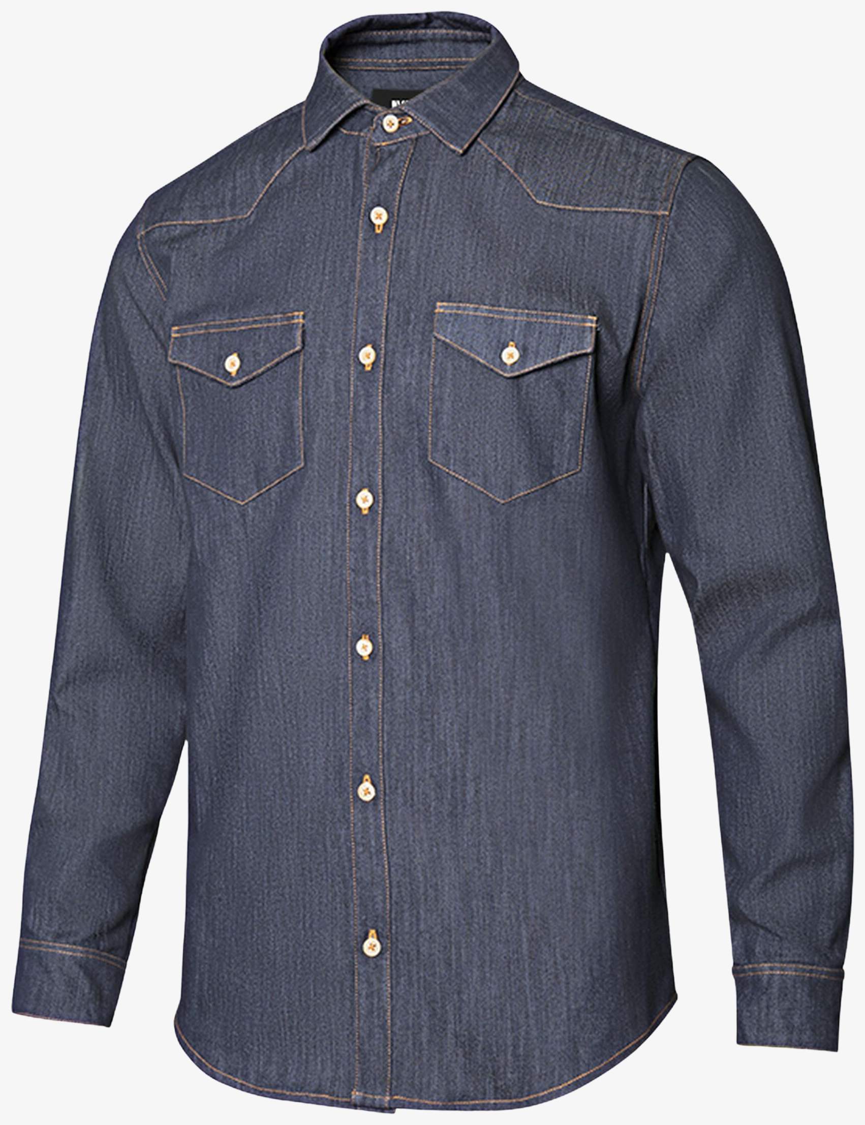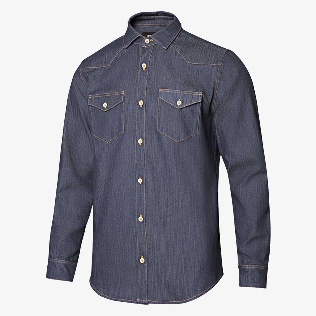 Koszula stretch denim męska jest wykonana z zapięciem na guziki i kołnierzem włoskim. Posiada wstawkę z przodu na plecach oraz manżety na guziki z dwoma pozycjami. Dwie kieszenie na piersi z klapką na guzik uzupełniają jej funkcjonalność. Materiał stretch zawiera 98% bawełny i 2% elastanu.