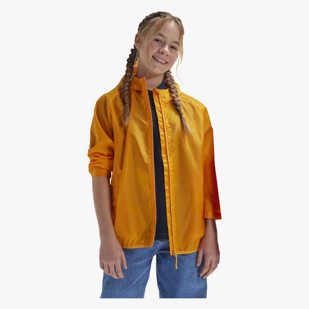 Kurtka przeciwwiatrowa Kids Reset wykonana z poliestru 210T tafeta recyclé z trwałą powłoką hydrofobową bez PFAS. Odporna na wodę, wyposażona w elastyczny kaptur zgodny z normami bezpieczeństwa oraz rękawy raglanowe. Ubranie posiada dwie boczne kieszenie i można je złożyć do kieszeni zapinanej na zamek, noszonej w talii z elastyczną taśmą i klamrą. Mankiety półelastyczne, dół wzmocniony elastycznym obszyciem. Kurtka lekka i bez metki.