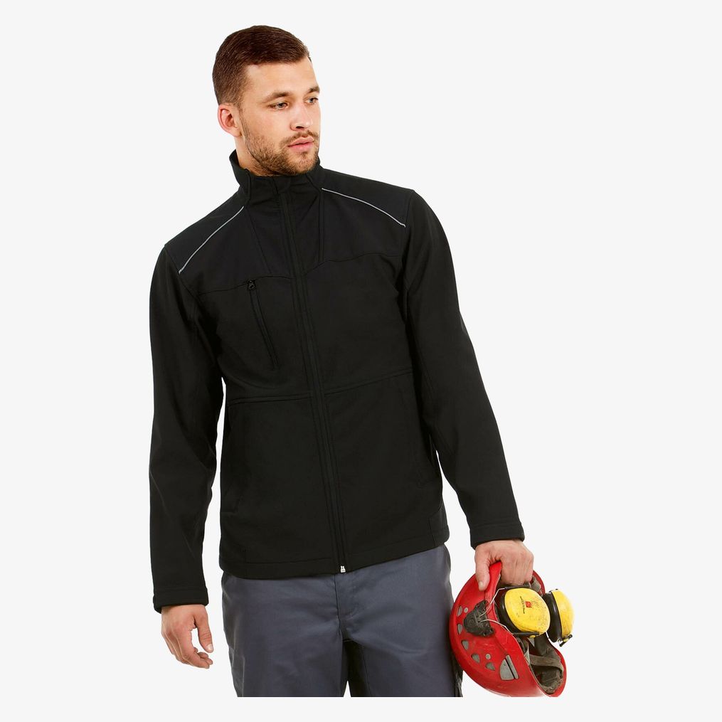 Kurtka softshell PRO 3-warstwowa wyposażona w wewnętrzną podszewkę z mikropolaru dla lepszego ocieplenia. Zawiera elementy wzmacniające na ramionach, łokciach i dolnym tylnym brzegu. Dłuższy tył ułatwia ruchy i ochronę podczas klęczenia lub pochylania się. Odblaskowa lamówka znajduje się na ramionach i dole pleców, aby zwiększyć widoczność. Bezszwowe ramiona poprawiają komfort i wodoodporność. Ergonomiczny krój i elastyczność materiału optymalizują swobodę ruchów. Pięć pojemnych kieszeni rozmieszczonych na zewnątrz i wewnątrz. Pełny dostęp do dekoracji z przodu, z tyłu i na rękawach. Regulowany dolny brzeg za pomocą stoperów na sznurki.