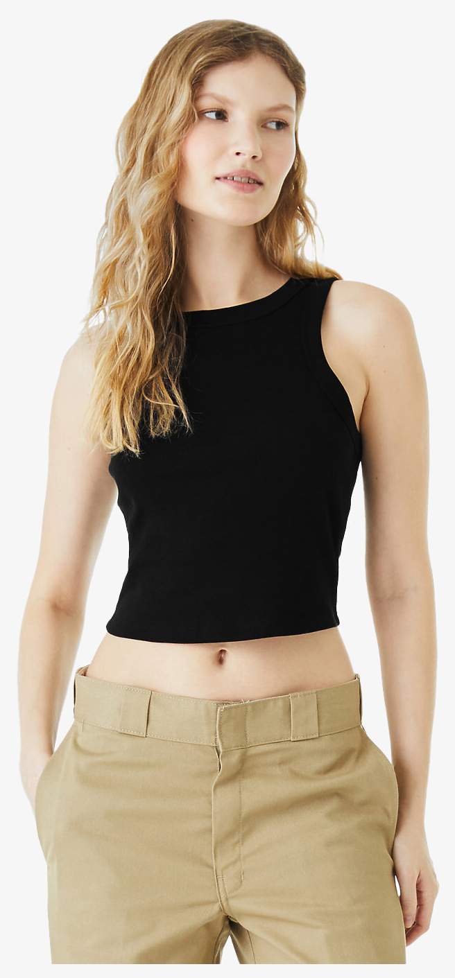 Dopasowany stretchowy top Women's micro rib racer tank łączy dopasowany, elastyczny krój z bocznymi szwami i wycięciem na plecach. Skład to 52% czesanej bawełny ringspun airlume i 48% poliestru, z wyjątkiem koloru Athletic Heather zawierającego 90% bawełny i 10% poliestru.