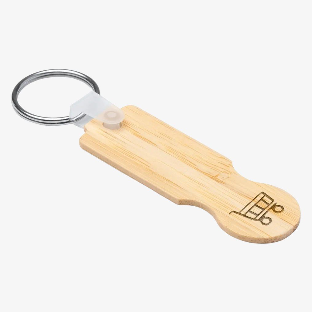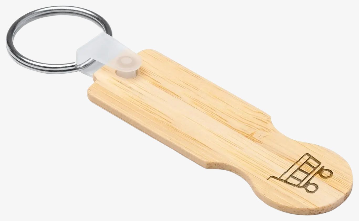Brelok bambusowy z żetonem do wózka sklepowego zawiera dużą powierzchnię do zapisu. Jego skład to bambus.