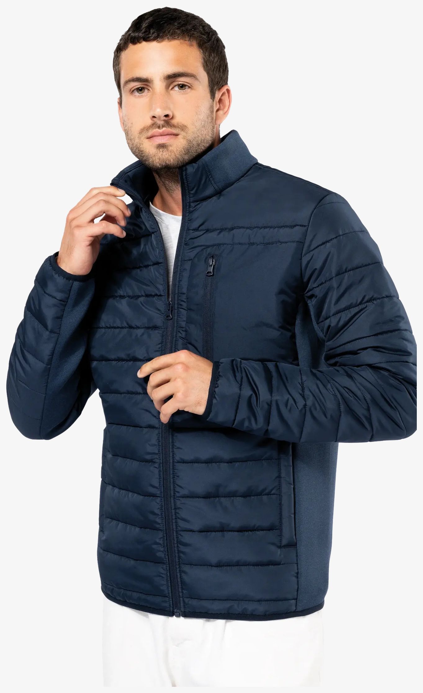 veste bi-matière homme ma pikowany przód i jedną trzecią tyłu. Zapięcie z przodu na odwrócony nylonowy zamek, dwie kieszenie boczne z listewką i kieszeń na piersi zapinana na odwrócony zamek. Kołnierz z dwuwarstwowymi wstawkami. Dolne krawędzie rękawów i ubrania wykończone elastyczną lamówką.