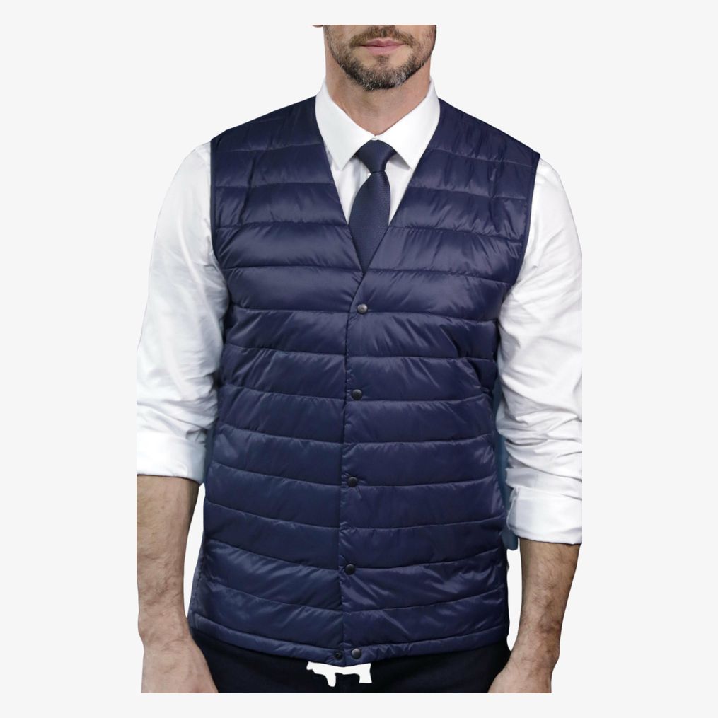 Lekka kamizelka bez rękawów dla mężczyzn wykonana z wodoodpornego materiału, z dekoltem w serek i zapięciem na 5 zatrzasków. Model posiada dwie przednie kieszenie oraz system składania In Bag z zabezpieczeniami.