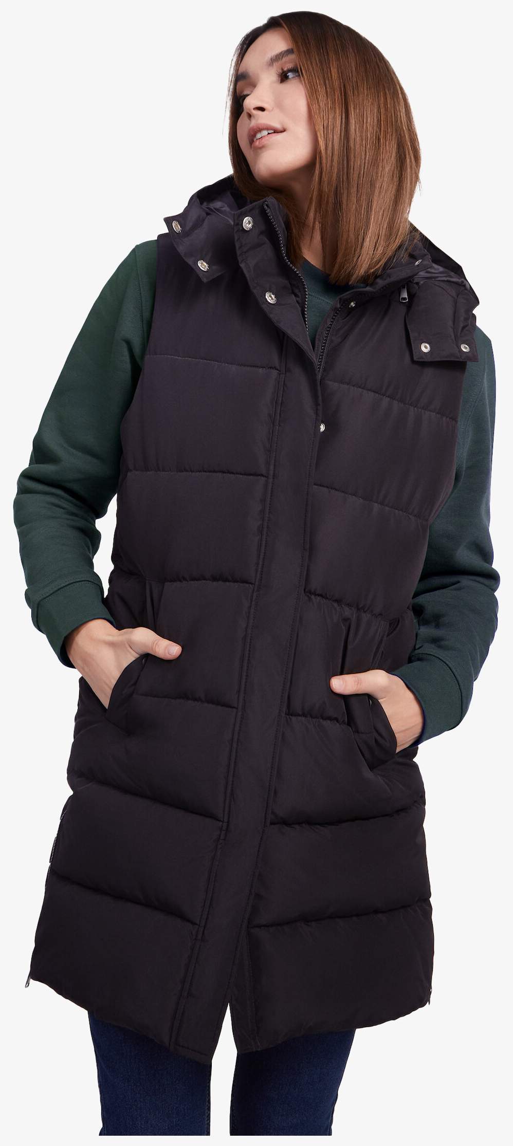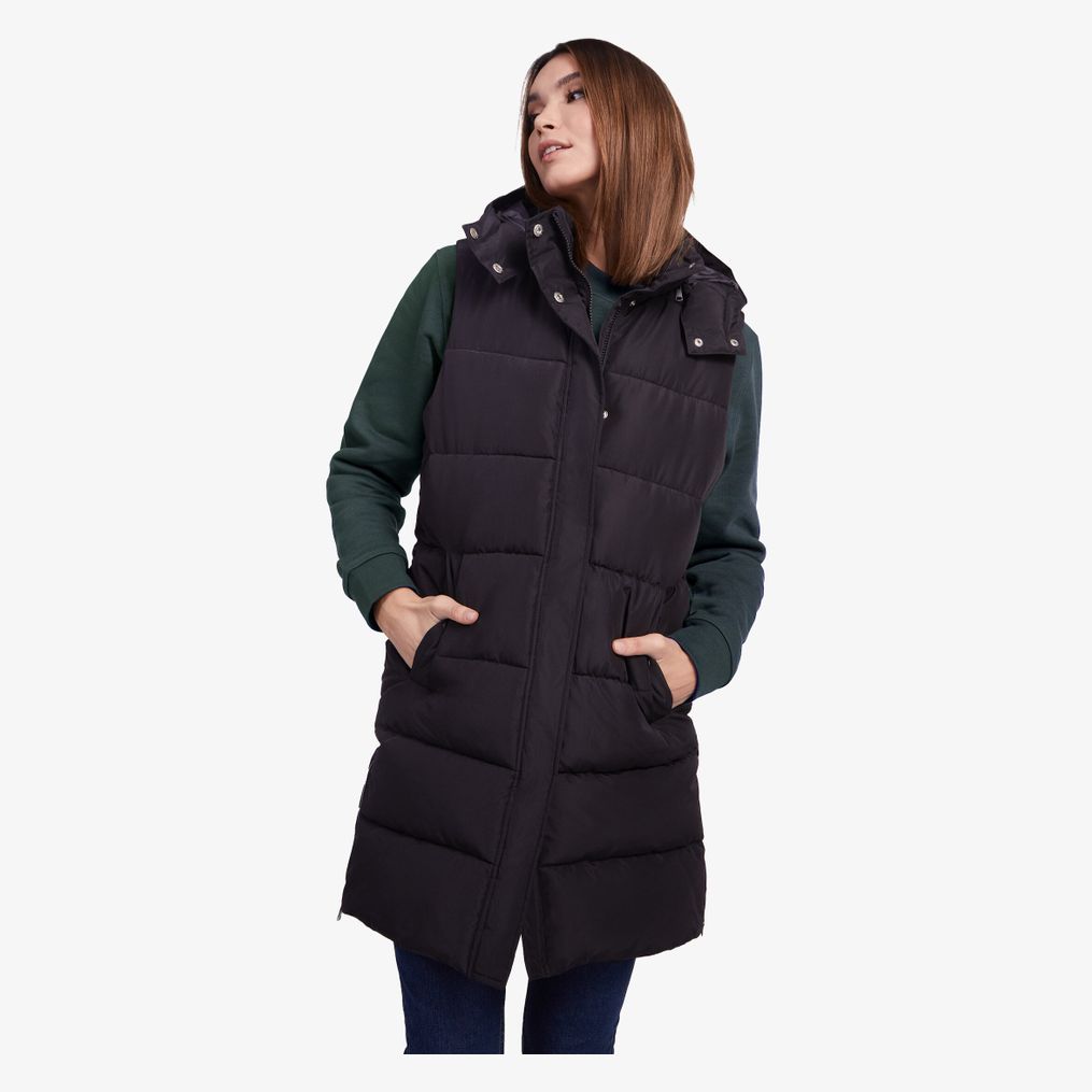 Bezrękawnik Reine zaprojektowany z odpinanym kapturem i stójką. Posiada przedni zamek błyskawiczny ukryty pod listwą i dwie kieszenie na napy. Boczne otwory wyposażone w zamki błyskawiczne.