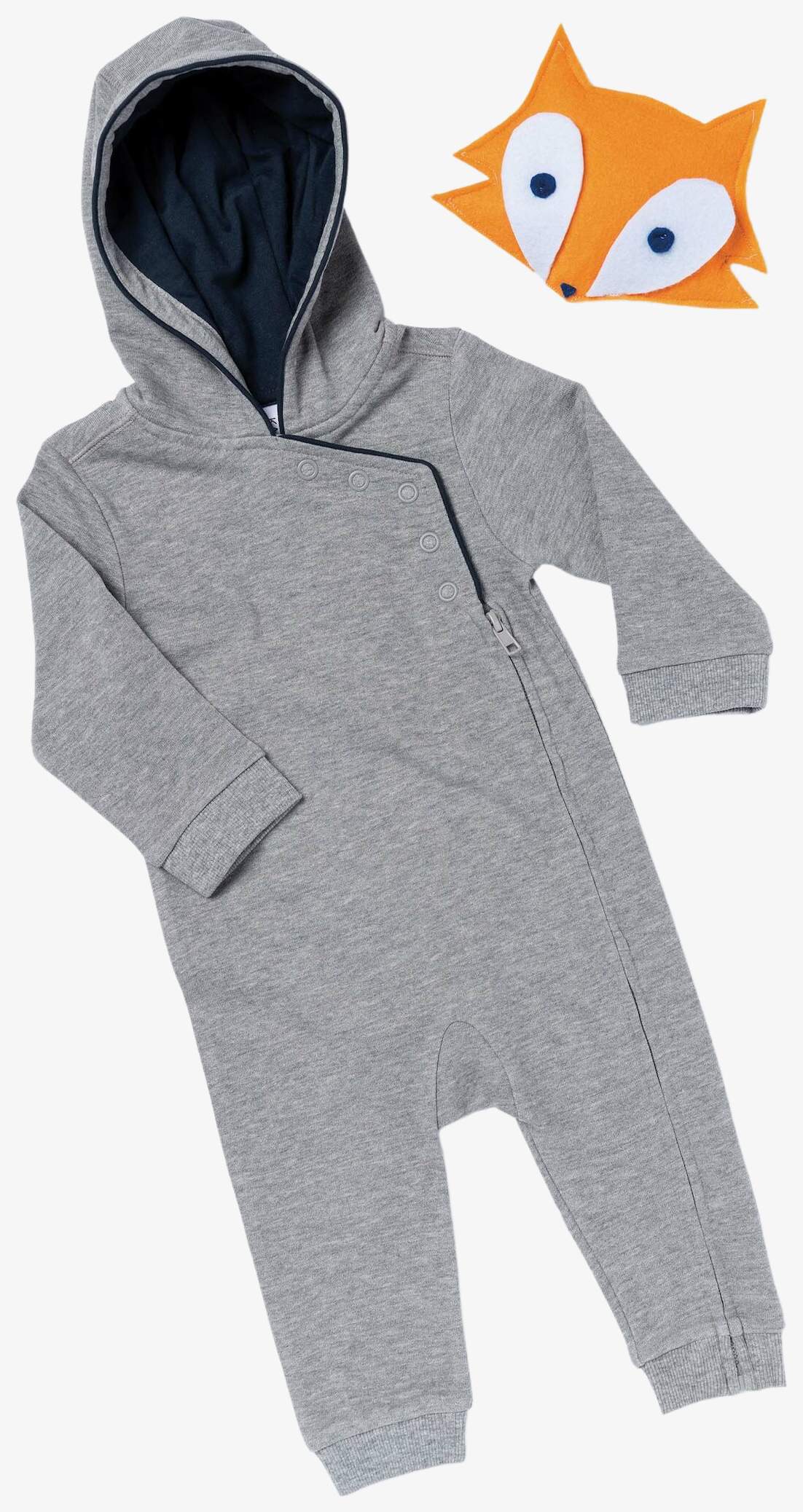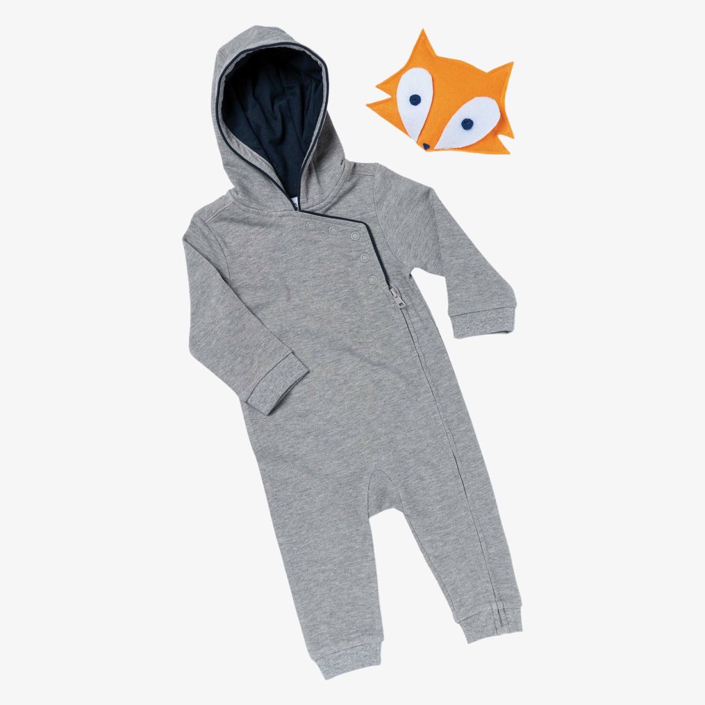 grenouillère bébé avec capuche wykonana z tkaniny w zależności od koloru: 85% bawełna i 15% wiskoza dla tkaniny Oxford Grey, 100% bawełna dla tkaniny Navy. Posiada przednie zapięcie na zamek i zatrzaski. Wnętrze kaptura z kontrastowym wykończeniem, mankiety rękawów i nogawek wykończone prążkowanym ściągaczem.