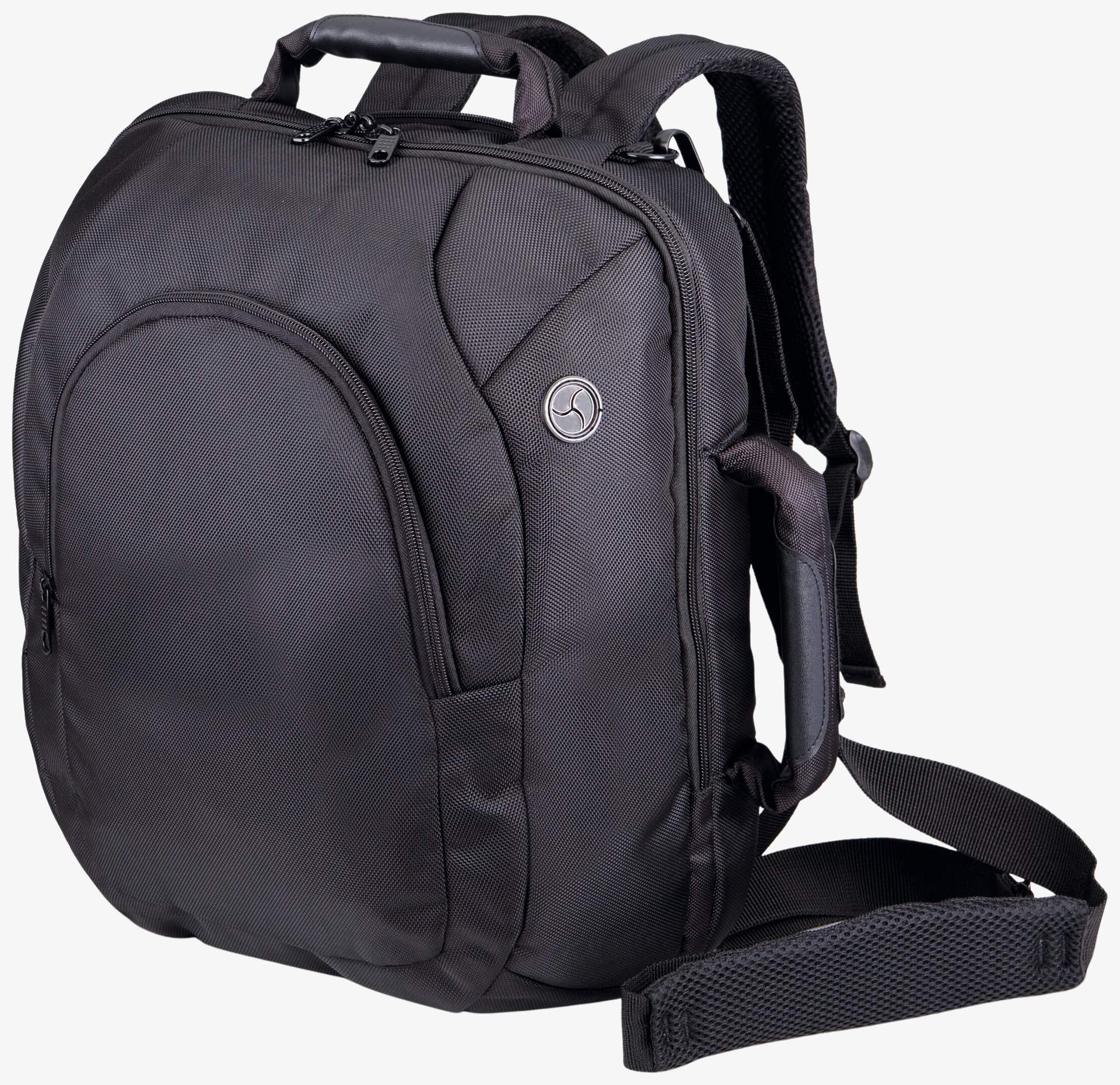 Sac à dos ordinateur umożliwia użytkowanie jako plecak lub torba na dokumenty, z chowanymi szelkami i regulowanym, odpinanym paskiem na ramię. Wyściełana przegroda centralna jest odpowiednia dla komputera do 17\" oraz dokumentów. Przednia kieszeń, otwór na słuchawki i zintegrowany uchwyt na klucze.