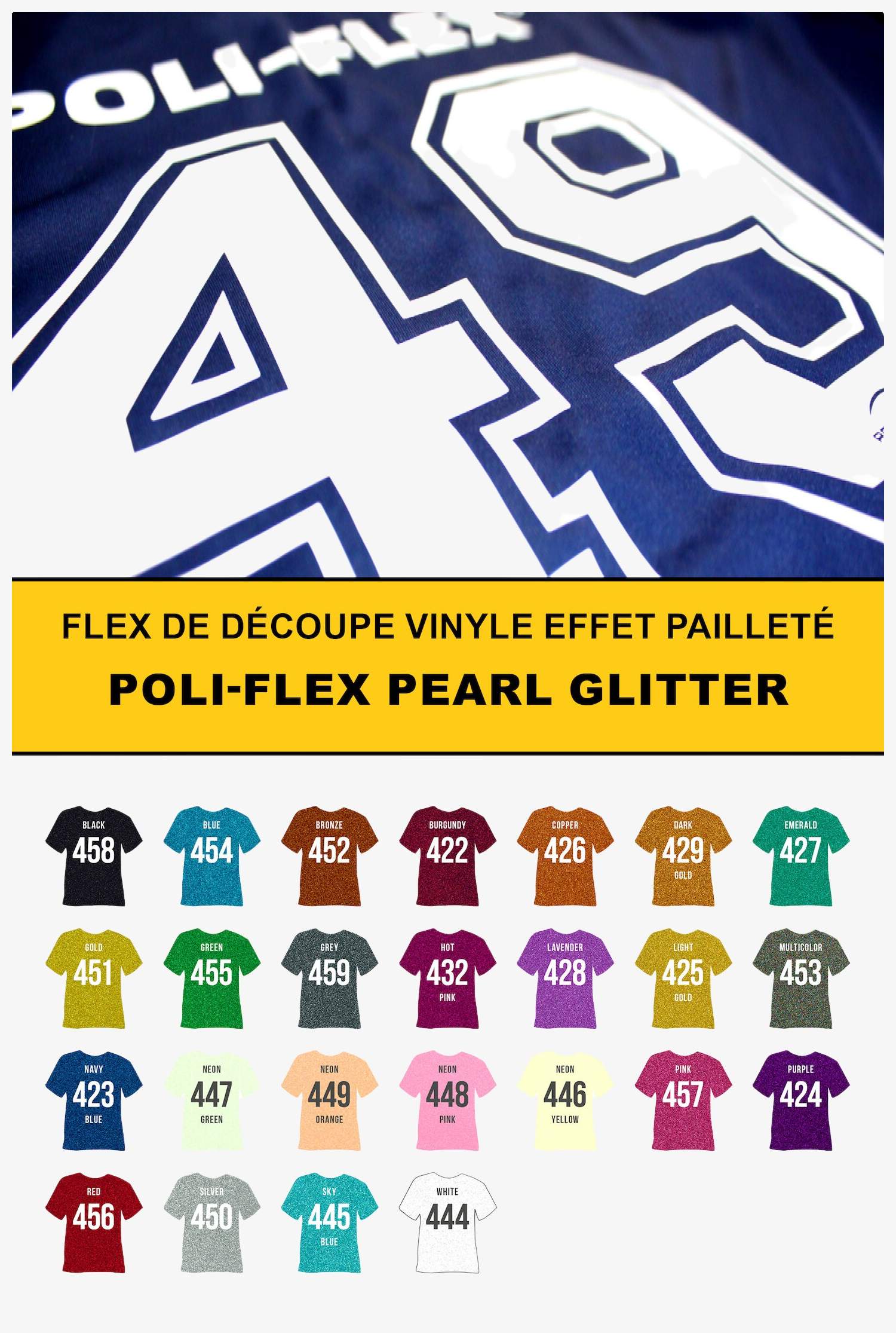 Poli-Flex® Pearl Glitter to folia flex winylowa z efektem brokatu przeznaczona do cięcia. Ten gorąco klejony kopolimer ma grubość 0,34 mm ±10% oraz powłokę z samoprzylepnego filmu PET. Transfer odbywa się w 160 °C przy średnim ciśnieniu 2,5 bara przez 15 sekund.