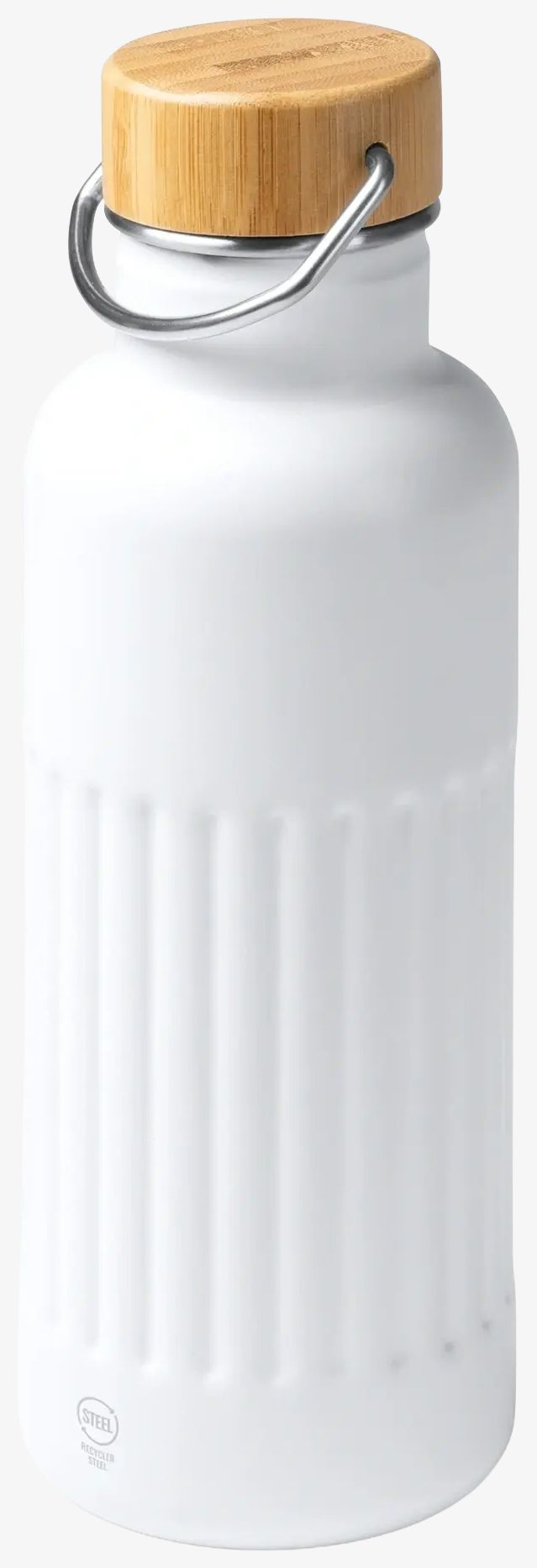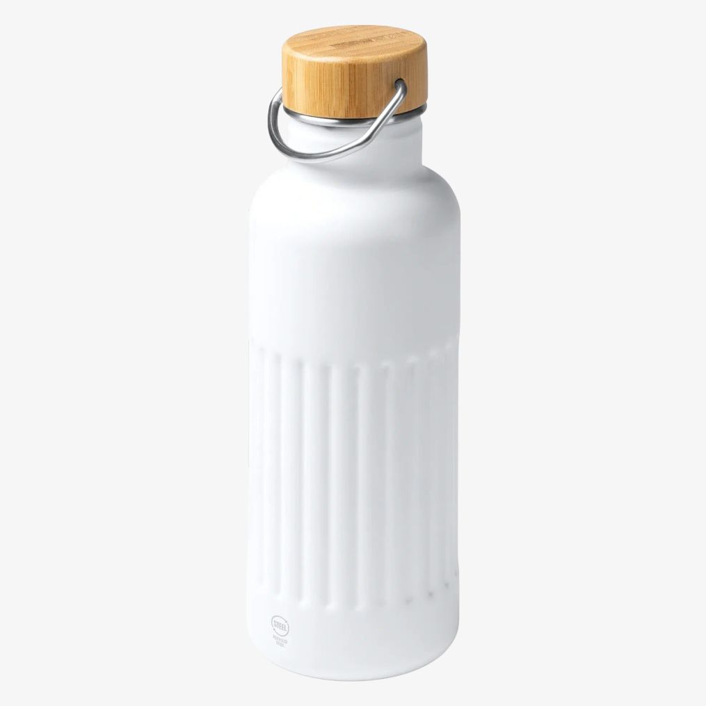 Butelka termiczna ze stali nierdzewnej 304 z recyklingu posiada podwójną ściankę ukośną oraz bambusową pokrywkę. Pojemność wynosi 500 ml. Prezentacja w opakowaniu ekologicznym.