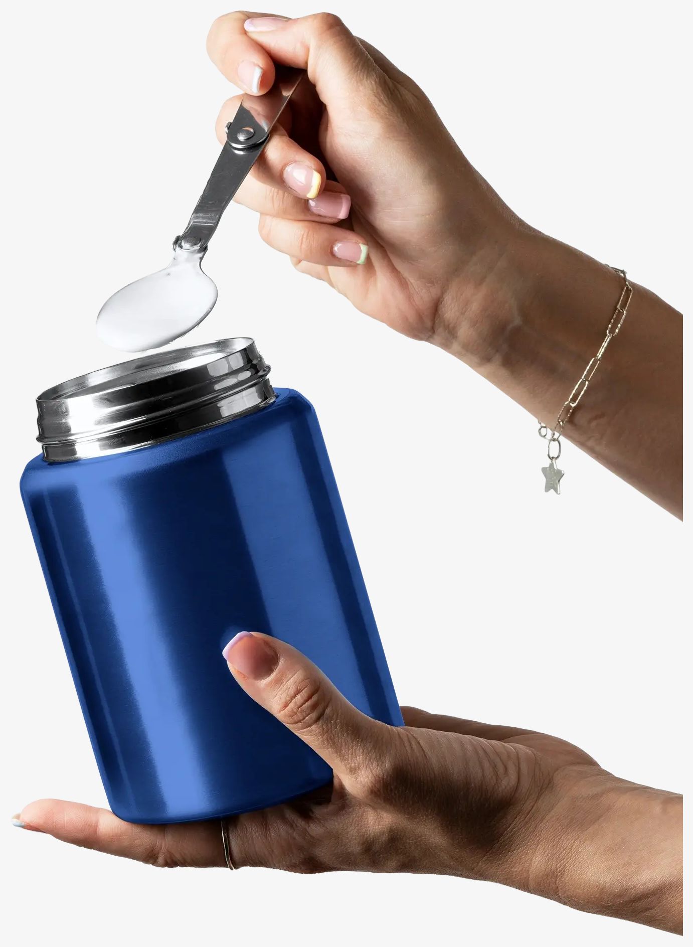 Termiczny pojemnik z podwójną ścianką ze stali nierdzewnej 304 przeznaczony do przechowywania posiłków. Zawiera podwójne zamknięcie i składana łyżkę ze stali nierdzewnej. Pojemność 450 ml, wymiary 15,7 x 9,5 cm.