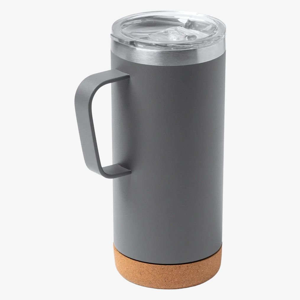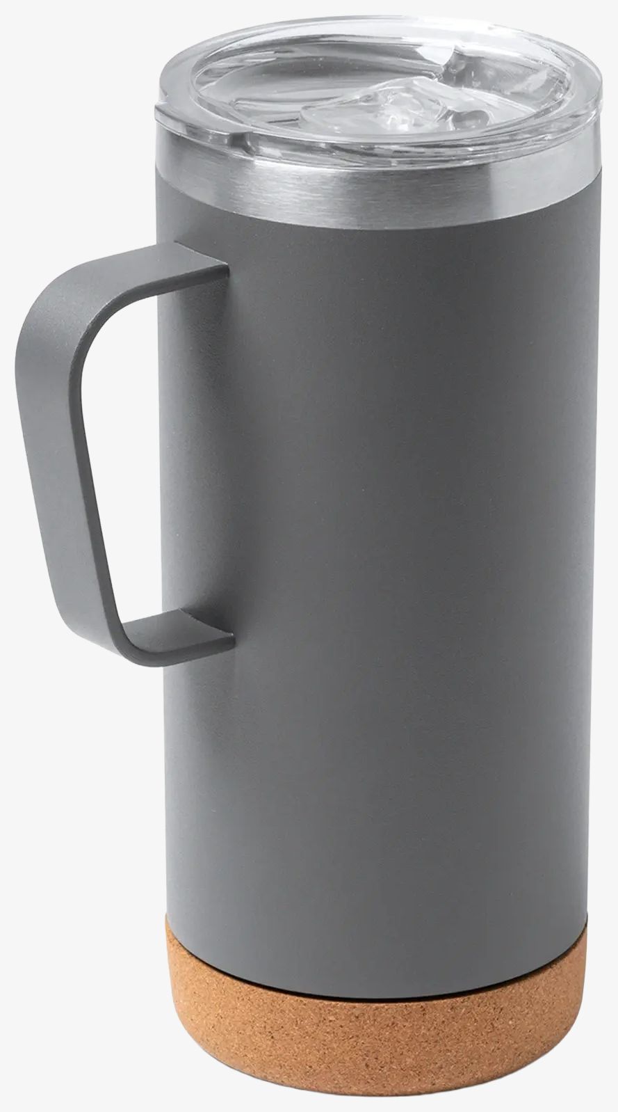 Kubek ze stali nierdzewnej z podwójną ścianką, wykonany z materiałów z recyklingu, z korkową podstawą i przezroczystą pokrywką zabezpieczającą. Pojemność 600 ml i kompaktowe wymiary, odpowiednie do różnych zastosowań.