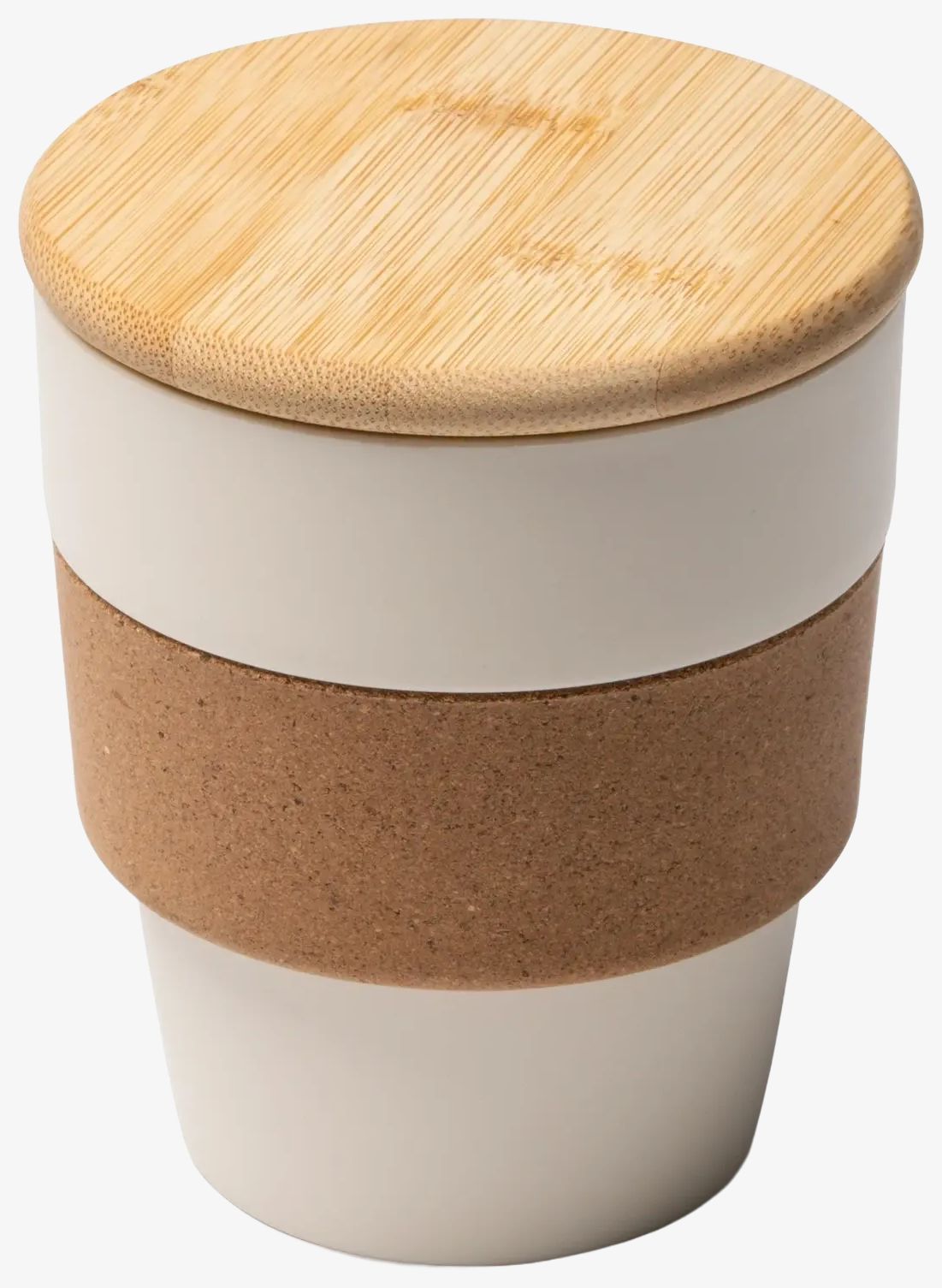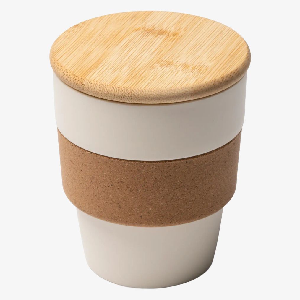 Kubek ma korpus z recyklingowanego polipropylenu z paskiem korkowym i bambusową pokrywką. Jego pojemność wynosi 350 ml, a wymiary 10,5 x 9 cm.