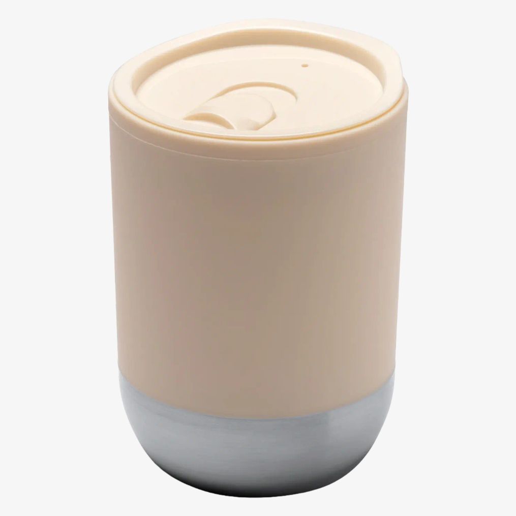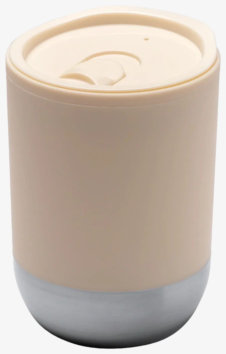 Kubek z podwójną ścianką zawiera korpus z recyklingowanego polipropylenu oraz podstawę ze stali nierdzewnej 304. Posiada pokrywkę dozującą i oferuje pojemność 290 ml.