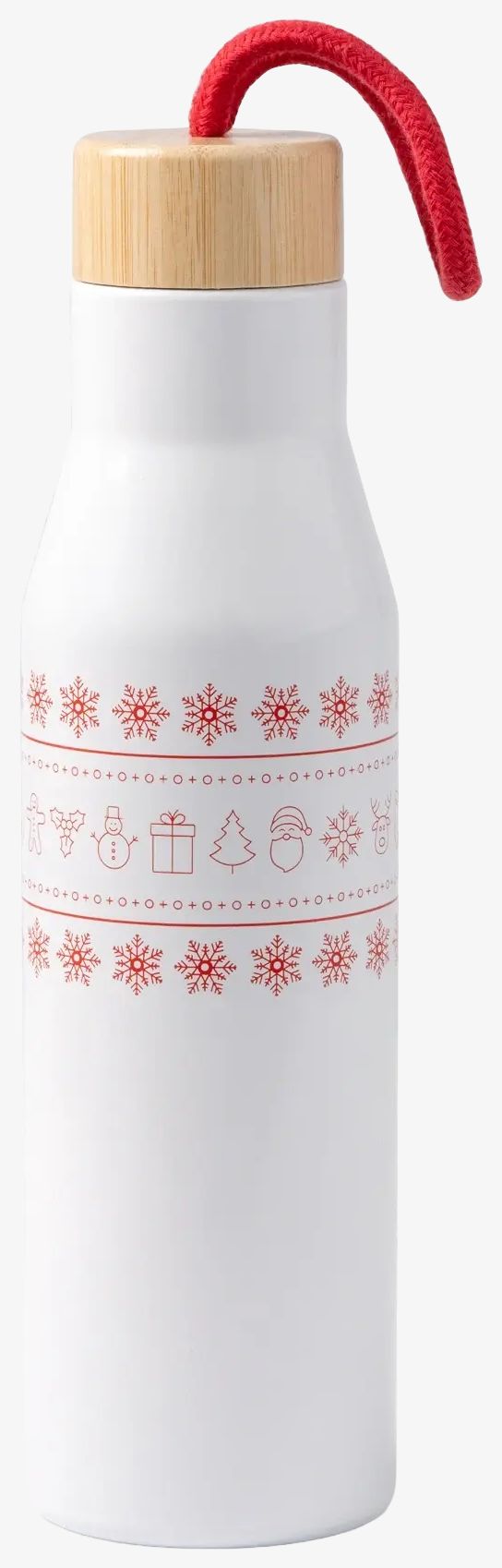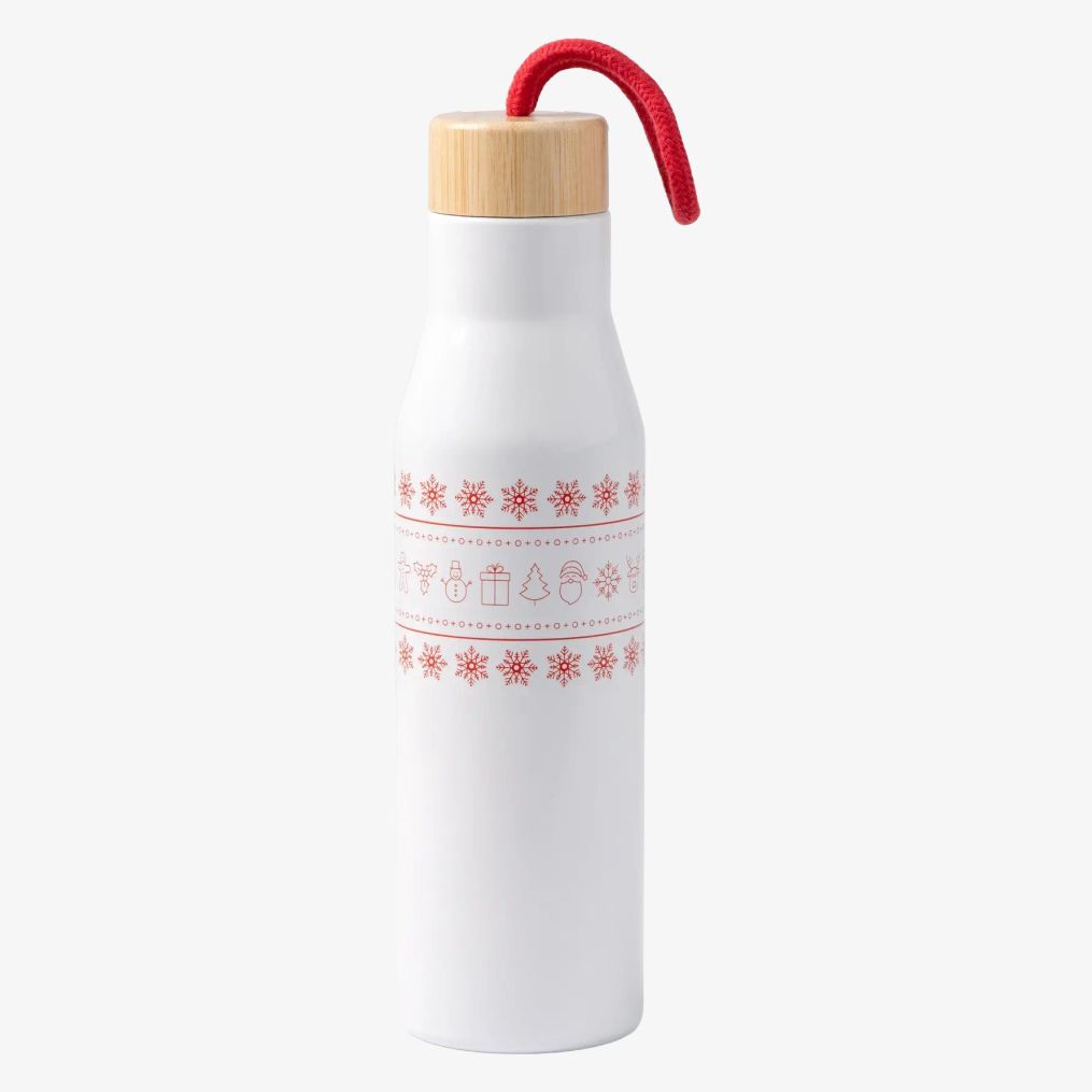 Butelka ze stali nierdzewnej z podwójną ścianką posiada bambusową pokrywkę z motywem świątecznym na obwodzie oraz bawełniany uchwyt. Pojemność 500 ml, odpowiednia do przechowywania napojów gorących lub zimnych.
