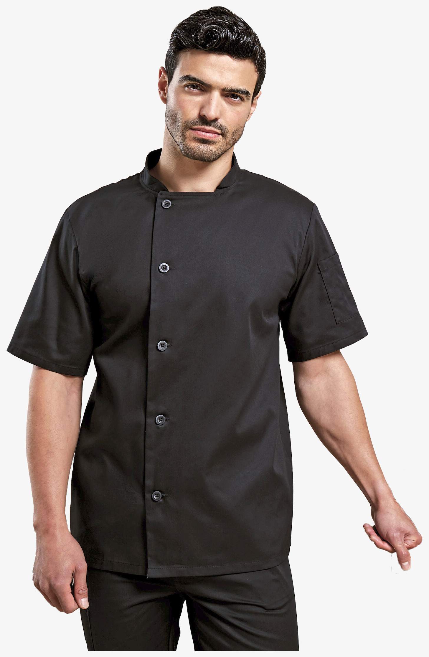 Kurtka kucharska z krótkim rękawem wykonana z podwójnej tkaniny z bawełnianego twillu i poliestru. Zapięcie znajduje się po prawej stronie tułowia na 5 guzików z żywicy trwałej. Kołnierz mandaryński. Kieszeń na długopis umieszczona na lewym rękawie.