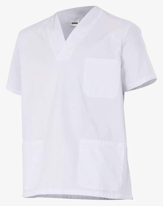 tunique manches courtes cechuje się dekoltem w serek, bocznymi rozcięciami oraz trzema kieszeniami: jedną na wysokości piersi i dwiema z przodu. Skład to 65% poliester i 35% bawełna.