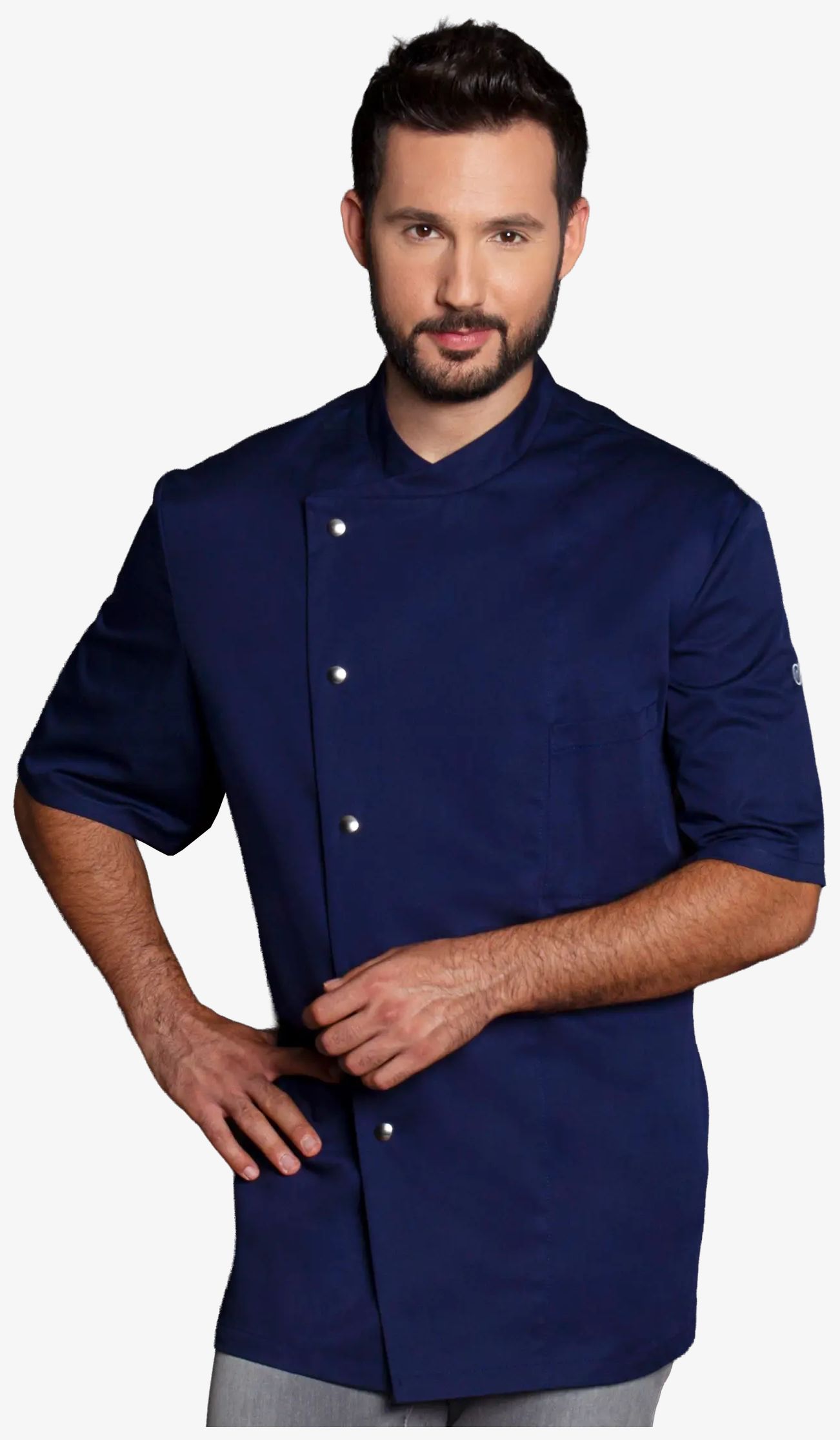 Kurtka kucharska Gustav ma klasyczny krój z krótkimi rękawami. Posiada kieszeń na piersi po lewej stronie z przegrodą na długopis i zapinana jest na 5 zatrzasków.