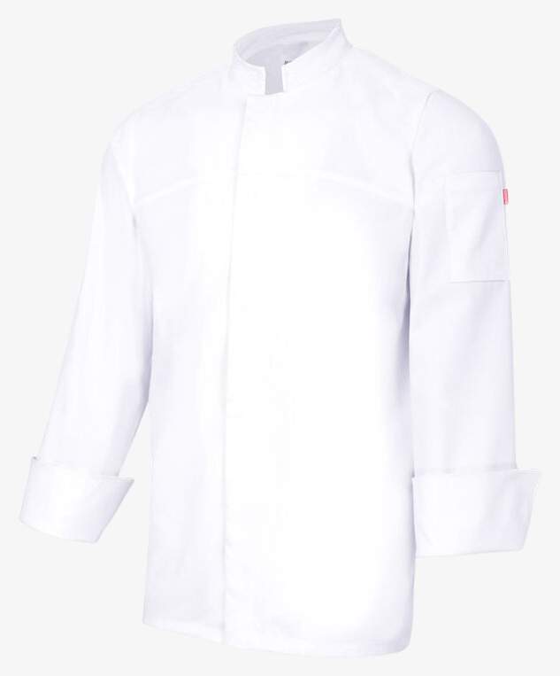 veste cuisine stretch posiada zamknięcie na ukryte zatrzaski, kołnierz mao oraz długie rękawy z rozcięciami przy mankietach. Kieszeń znajduje się na lewym rękawie.