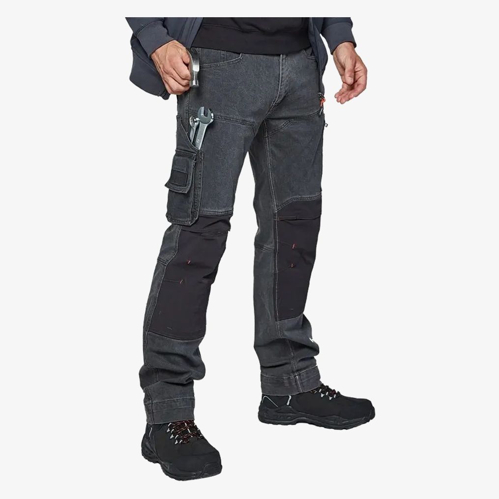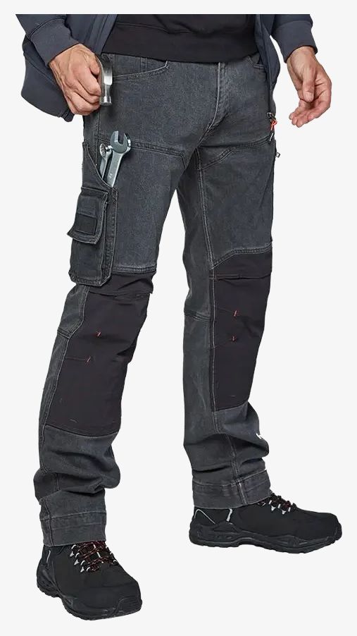 Sphinx Jeans Trousers to lekkie elastyczne spodnie robocze z regulacją temperatury. Niewidoczne gumki po bokach dla komfortu. Wiele kieszeni, wzmocnienia na kolanach i uchwyt na młotek.
