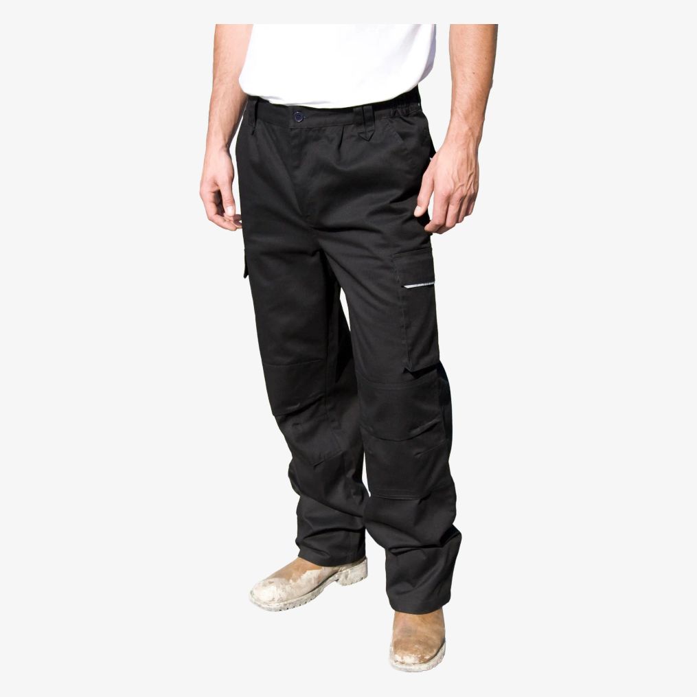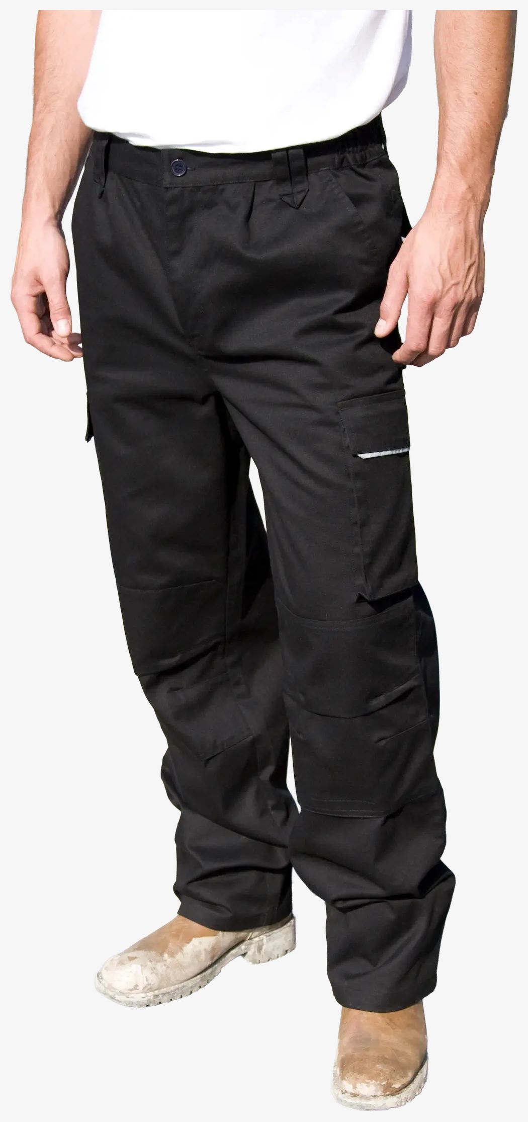 Spodnie robocze Action Trousers r308m z diagonalu polibawełnianego, z elastycznym pasem, taśmami odblaskowymi oraz kieszeniami na kolana na nakolanniki. Wiele kieszeni, wzmocnione szwy, szlufki na pasek i akcesoria, podwinięcie 2,5 cm.