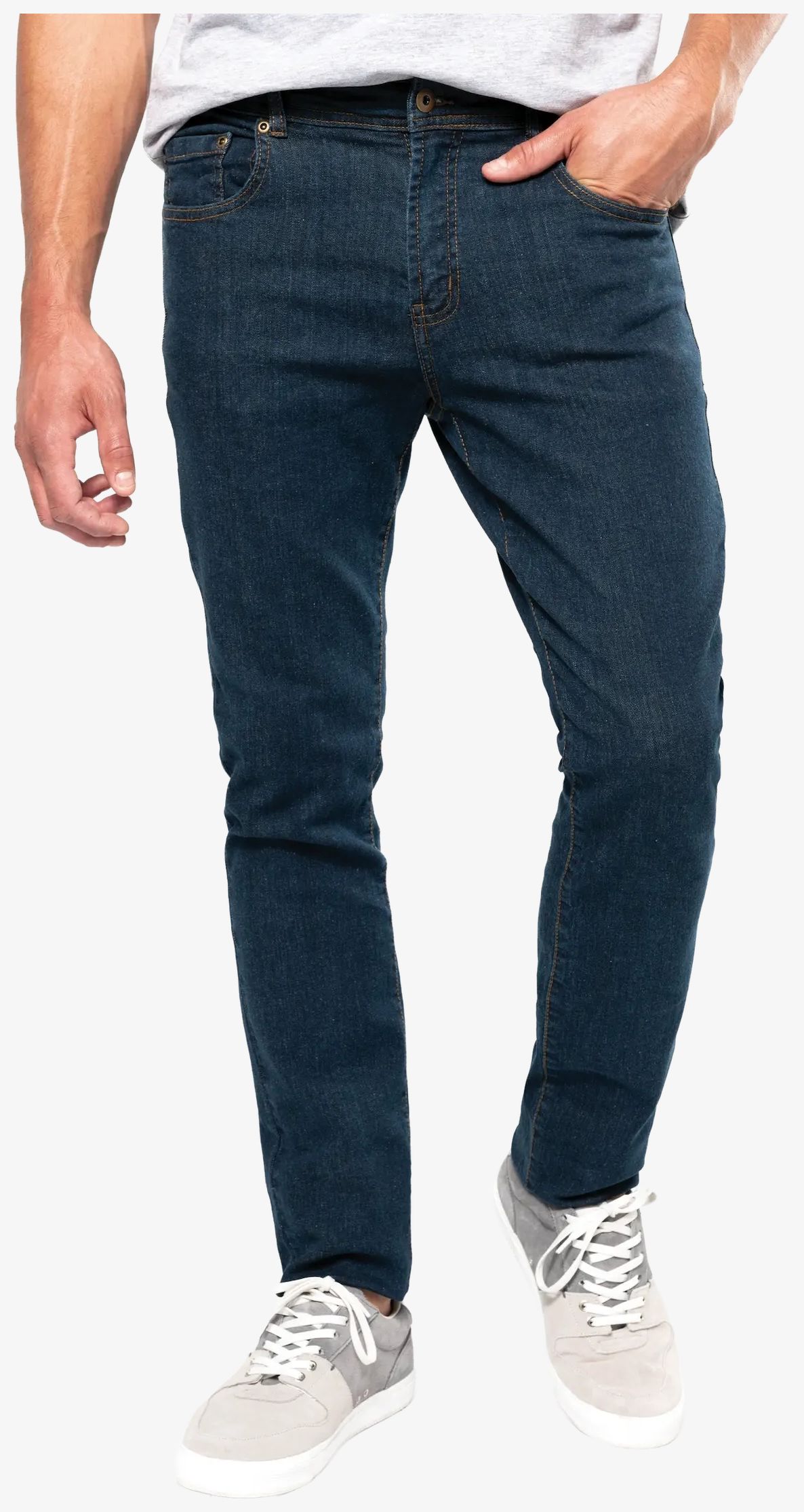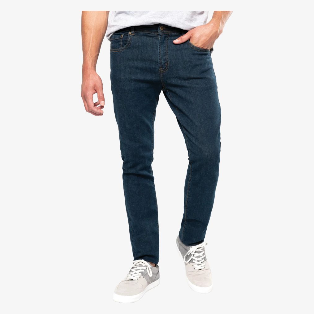 jean basic homme wykonane są głównie z bawełny, z zamkiem błyskawicznym i metalowym guzikiem. Posiadają 2 kieszenie z przodu, kieszeń na bilet oraz 2 naszywane kieszenie z tyłu. Pasek wyposażony jest w szlufki, a szwy są kontrastowe. Model ma postarzały wygląd uzyskany specjalną obróbką, z różnicami kolorystycznymi między sztukami.