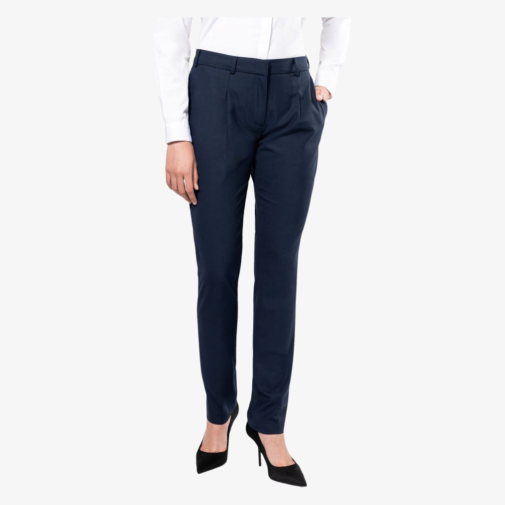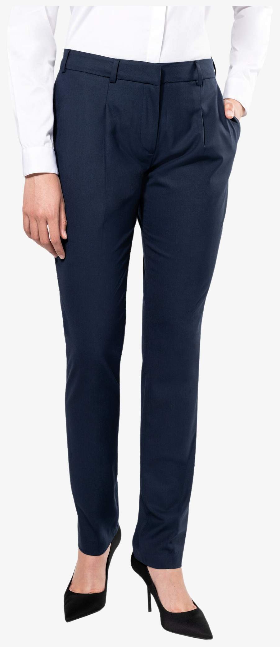 pantalon City femme ma dopasowany krój i tonowaną podszewkę z 100% poliestru. Zawiera dwie boczne kieszenie i dwie tylne z lamówką. Zamek błyskawiczny jest uzupełniony metalowym haczykiem chronionym paskiem materiału przymocowanym guzikem dla lepszego komfortu. Talia wyposażona jest w szlufki na pasek i lamówkę wewnątrz wykończenia. Przednia nogawka ma zakładkę. Rozmiar wskazuje chip.