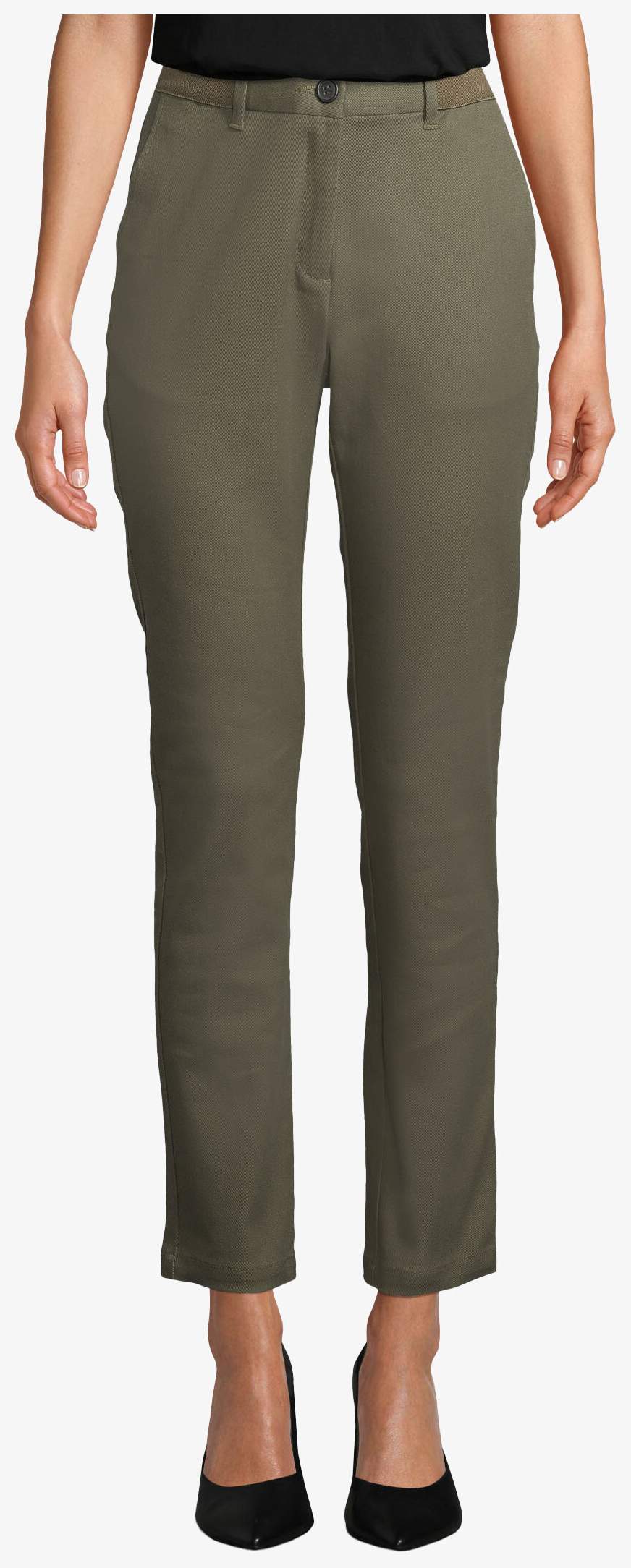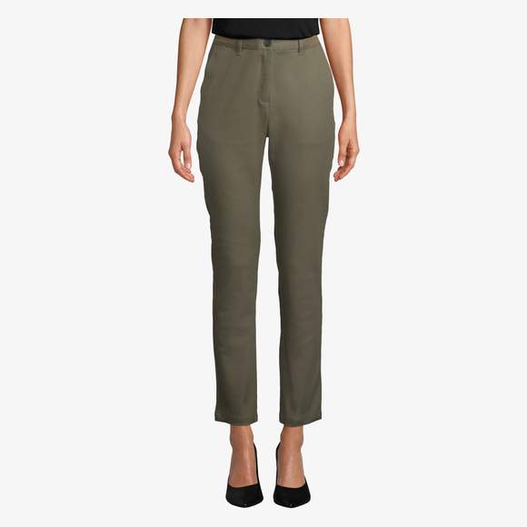 Spodnie chino damskie łączą bawełnę i elastan dla dopasowanego i wygodnego noszenia. Wyposażone w elastyczny pasek, szlufki na pasek, dwie przednie kieszenie typu włoskiego oraz dwie tylne kieszenie z patkami i guzikami.
