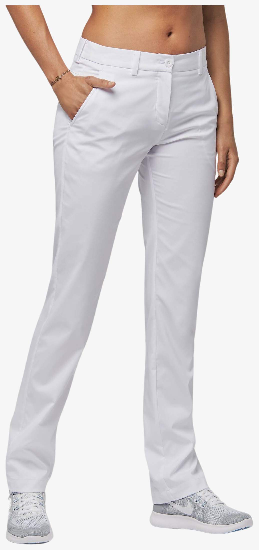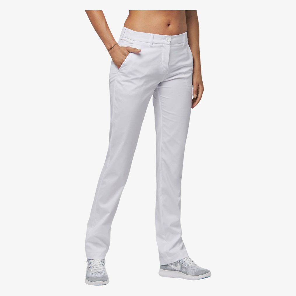 pantalon femme łączy 96% poliester i 4% elastan dla elastycznego i wodoodpornego materiału zapewniającego odpowiedni komfort. Krój jest dopasowany z paskiem wyposażonym w szlufki. Odzież posiada dwie głębokie kieszenie boczne oraz dwie tylne kieszenie z patkami.