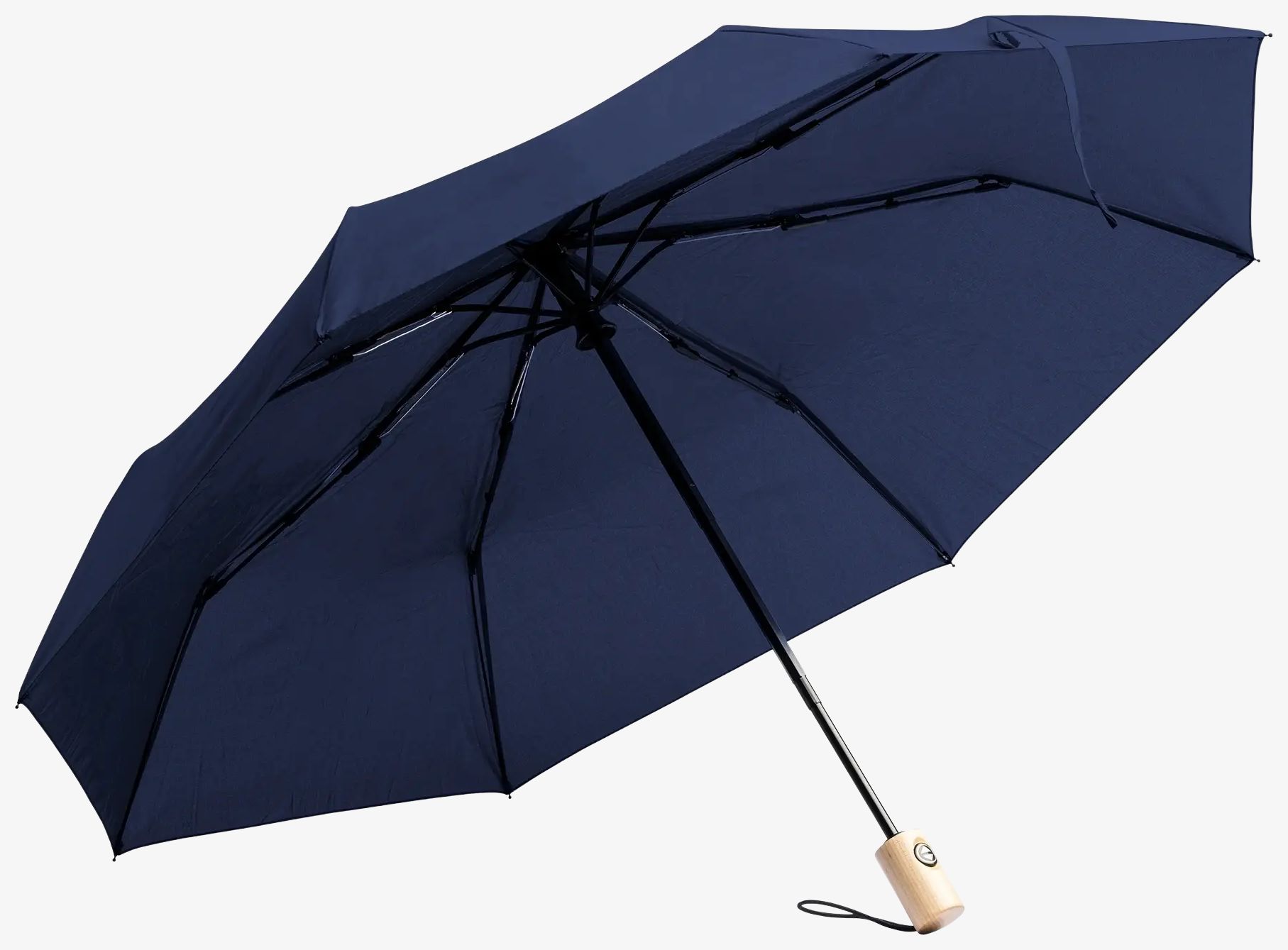 Parasol NAURO ma automatyczne otwieranie i zamykanie z materiału poliestrowego 190 T pongee oraz odpowiedni pokrowiec. Wyposażony w żebra z czarnymi końcówkami i bambusową rączkę. Zapięcie na dopasowaną taśmę rzepową.