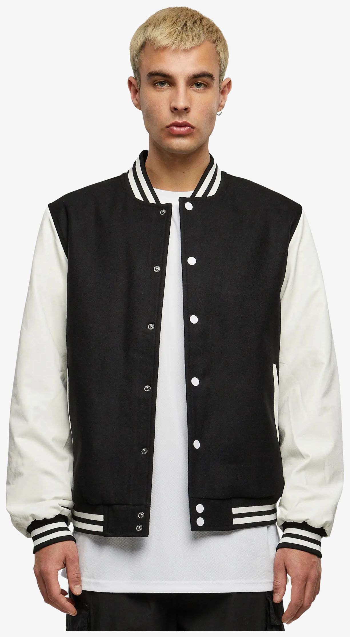 Oldschool College Jacket to uniwersytecka kurtka typu teddy z rękawami ze skóry ekologicznej, zapięciem na zatrzaski i kieszeniami po bokach. Drapowane wnętrze oraz ściągacze przy kołnierzu, mankietach i w pasie nadają się do codziennego użytku.