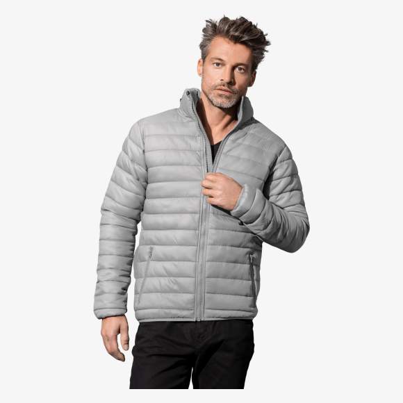 Męska pikowana kurtka ma błyszczący nylonowy zewnętrzny materiał oraz poliestrowe wypełnienie zapewniające lekką izolację termiczną. Zawiera stójkę z wbudowanym kapturem, zamki błyskawiczne w kontrastowym kolorze oraz pasek do zawieszania. Całość zaprojektowano tak, aby była odporna na wilgoć i wiatr, pozostając jednocześnie lekka.