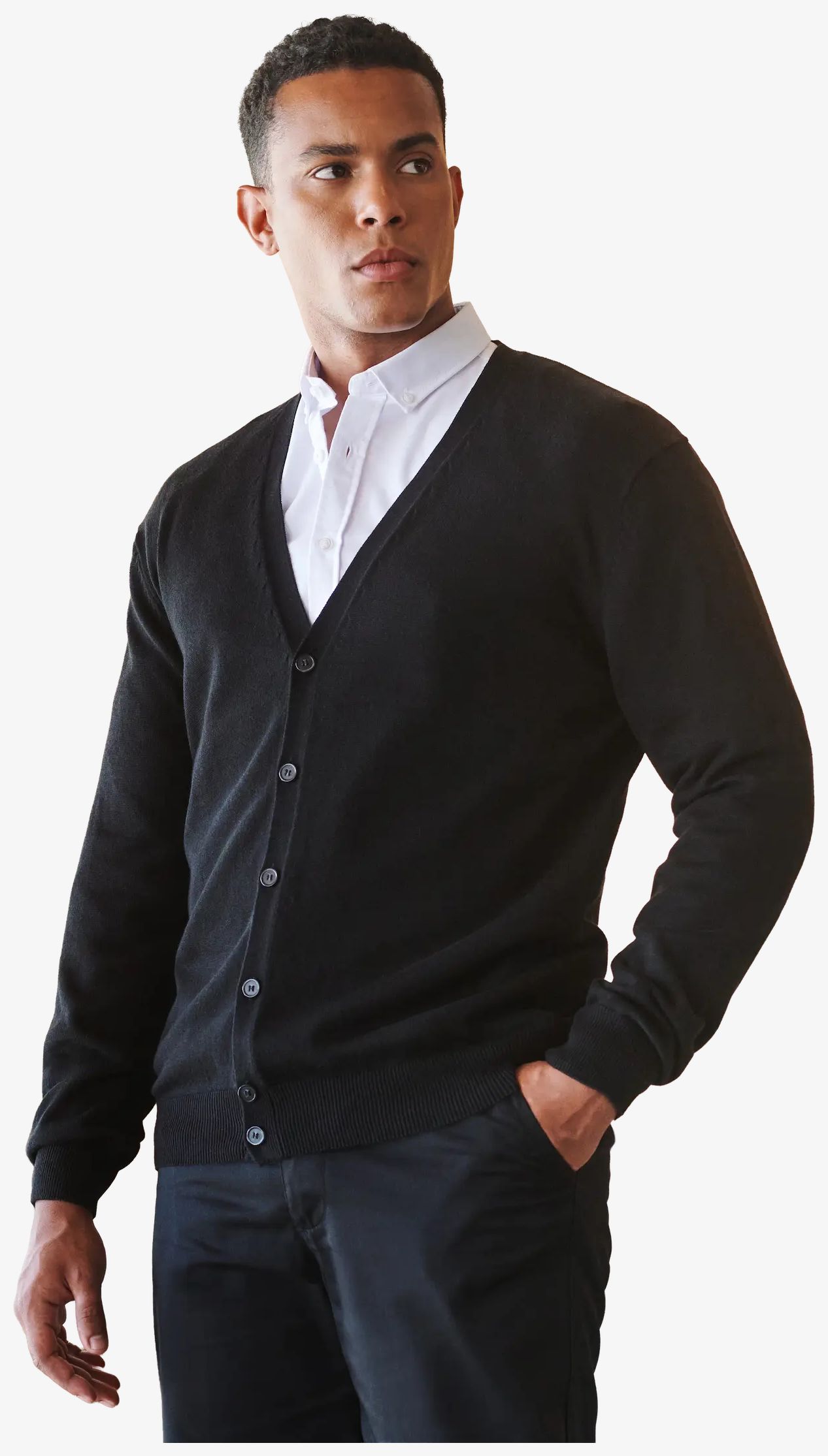 Men's v-neck button cardigan to kardigan męski z dekoltem w serek, zapinany na guziki, przeznaczony do codziennego użytku. Gęstość 12, wykończenia ze ściągaczami przy mankietach i u dołu. Skład: 50 % bawełna, 50 % akryl.