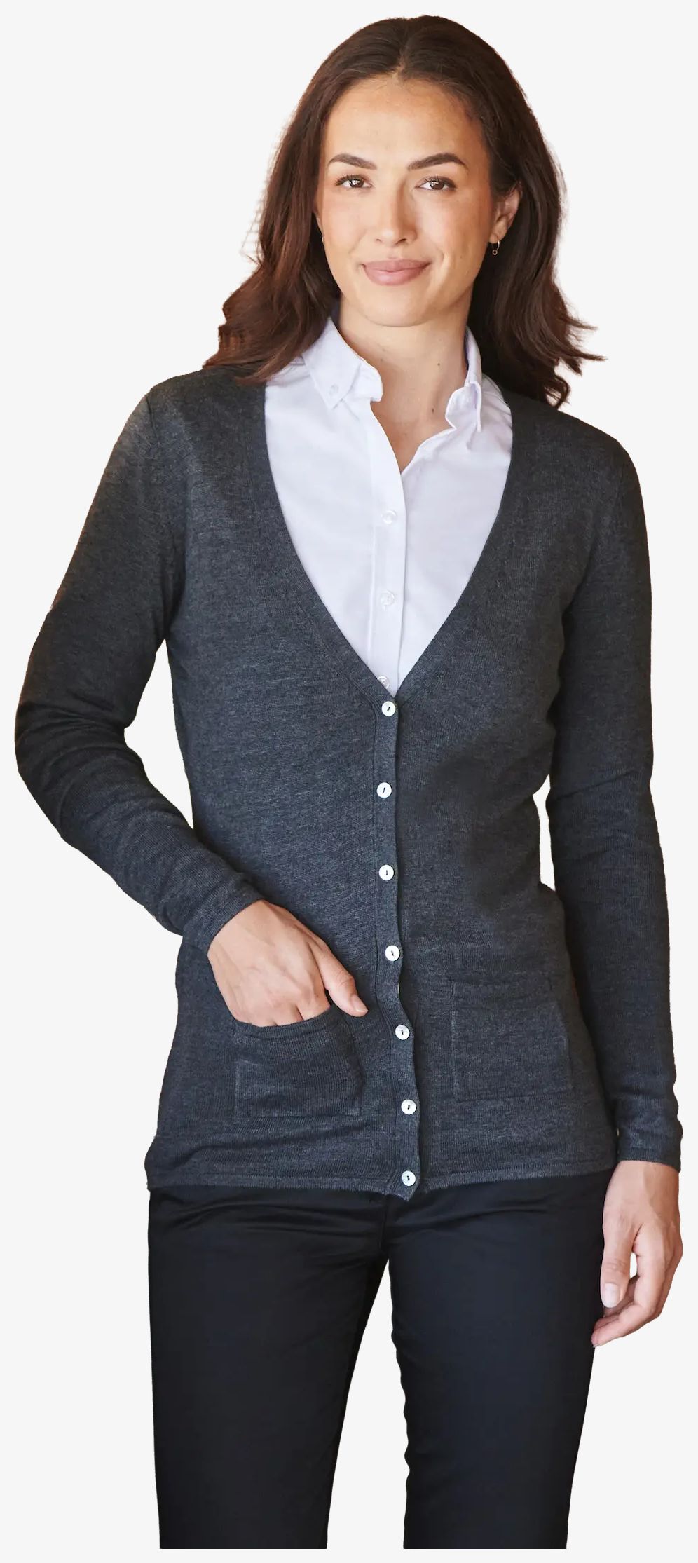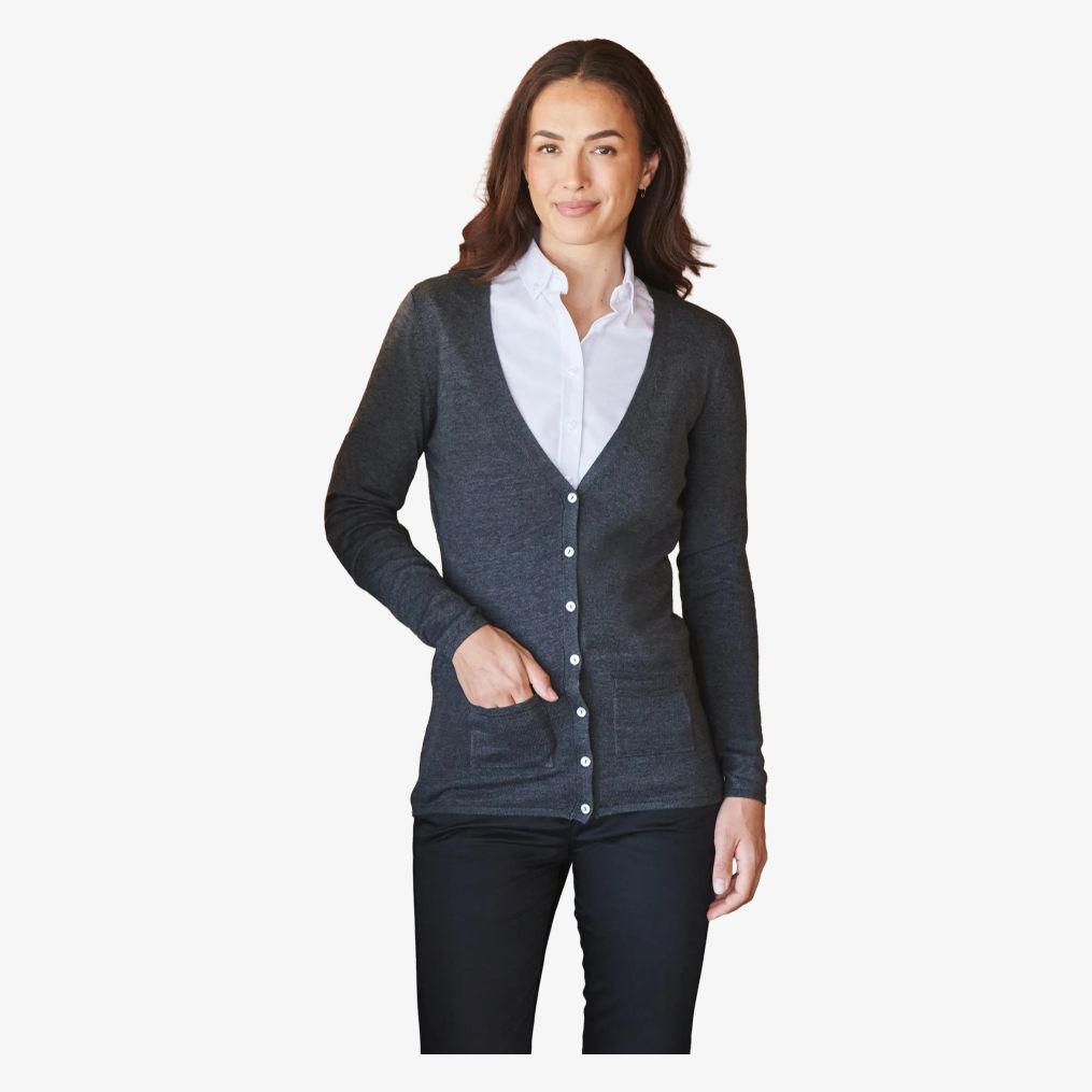 Ladies v-neck button pocket cardigan to damski kardigan z dekoltem w serek, zapinany na guziki, z 2 kieszeniami. Splot 12, ze ściągaczami przy mankietach i szerokimi, podwiniętymi wykończeniami u dołu, do codziennego noszenia.